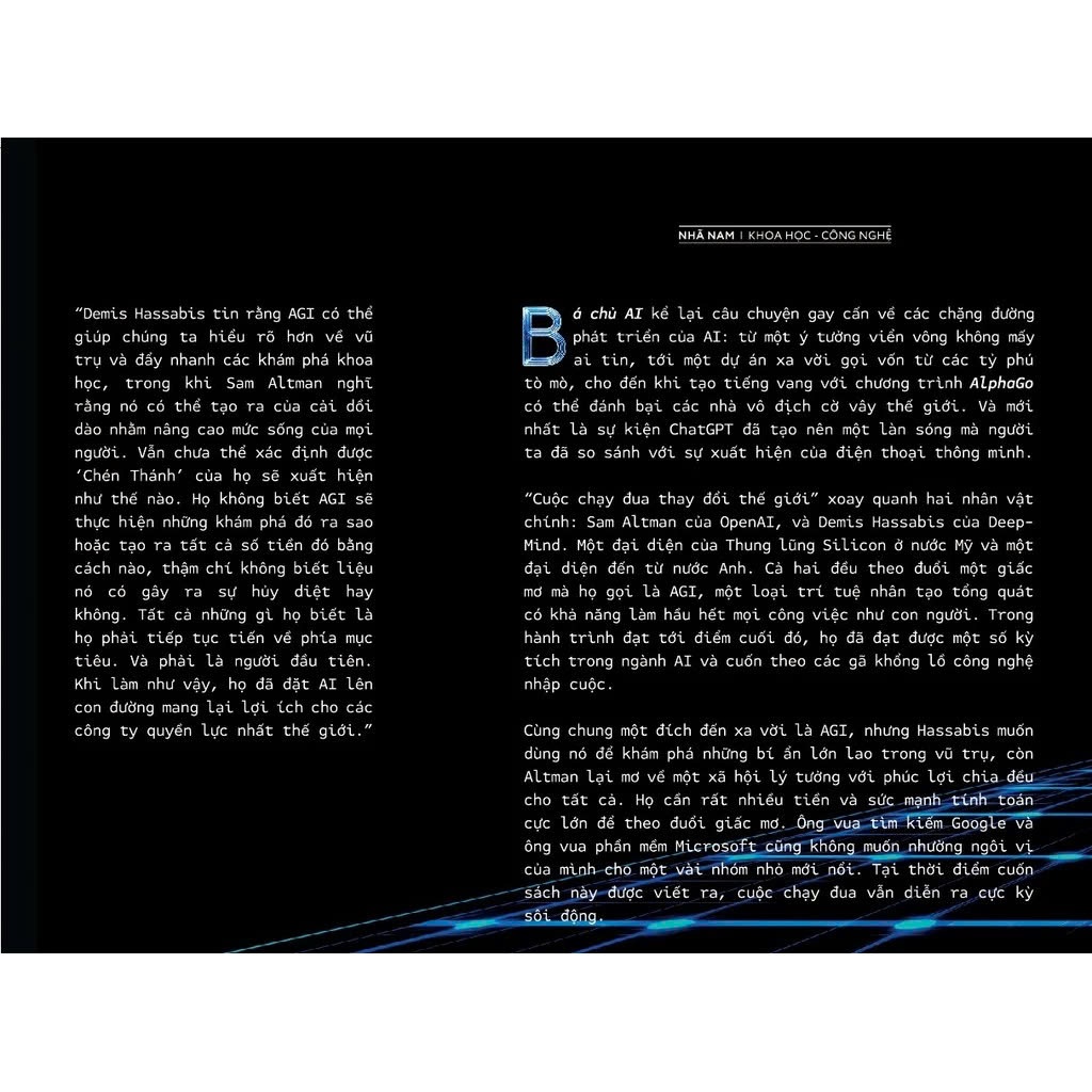 Cùng chung một đích đến xa vời là AGI, nhưng Hassabis muốn dùng nó để khám phá những bí ẩn lớn lao trong vũ trụ, còn Altman lại mơ về một xã hội lý tưởng với phúc lợi chia đều cho tất cả. Họ cần rất nhiều tiền và sức mạnh tính toán cực lớn để theo đuổi giấc mơ. Ông vua tìm kiếm Google và ông vua phần mềm Microsoft cũng không muốn nhường ngôi vị của mình cho một vài nhóm nhỏ mới nổi. Tại thời điểm cuốn sách này được viết ra, cuộc chạy đua vẫn diễn ra cực kỳ sôi động.