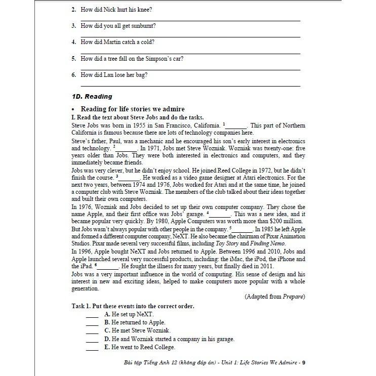 Bài tập dành cho mỗi đơn vị bài học gồm 6 phần: Pronunciation, Vocabulary, Grammar, Speaking, Reading, Writing và hai bài luyện tập Test 1 & 2 gồm 50 câu hỏi kiểm tra với bài tập phát triển các kĩ năng trên. Các bài Review giúp học sinh tự kiểm tra những nội dung kiến thức và rèn luyện các kĩ năng sau mỗi 3 đơn vị bài học.