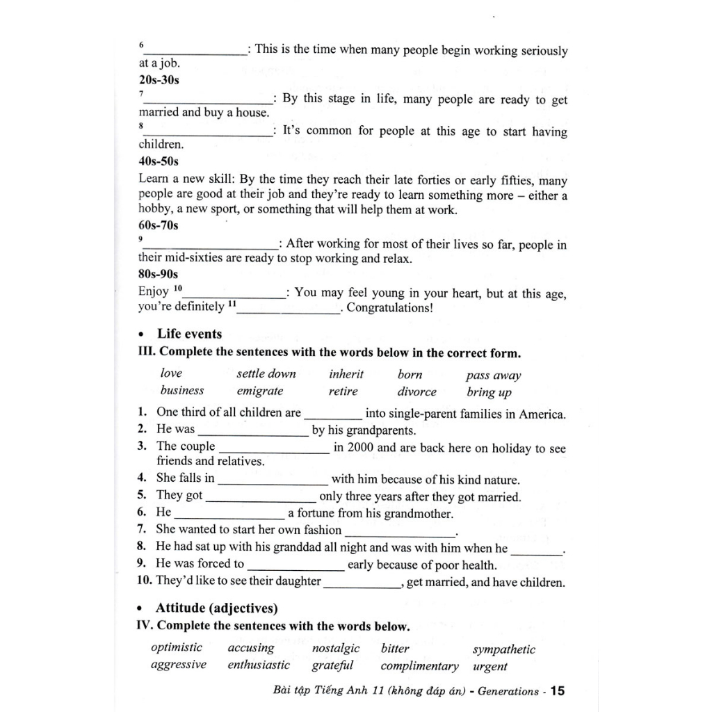 Bài tập Tiếng Anh 11 – Không đáp án gồm một bài ôn tập củng cố kiến thức đã học (Introduction), và 8 đơn vị bài học chính: Generations, Leisure time, Sustainable health, Home, Technology, High flyers, Artists, Cities. Sau mỗi đơn vị bài học đều có bài ôn tập Review.