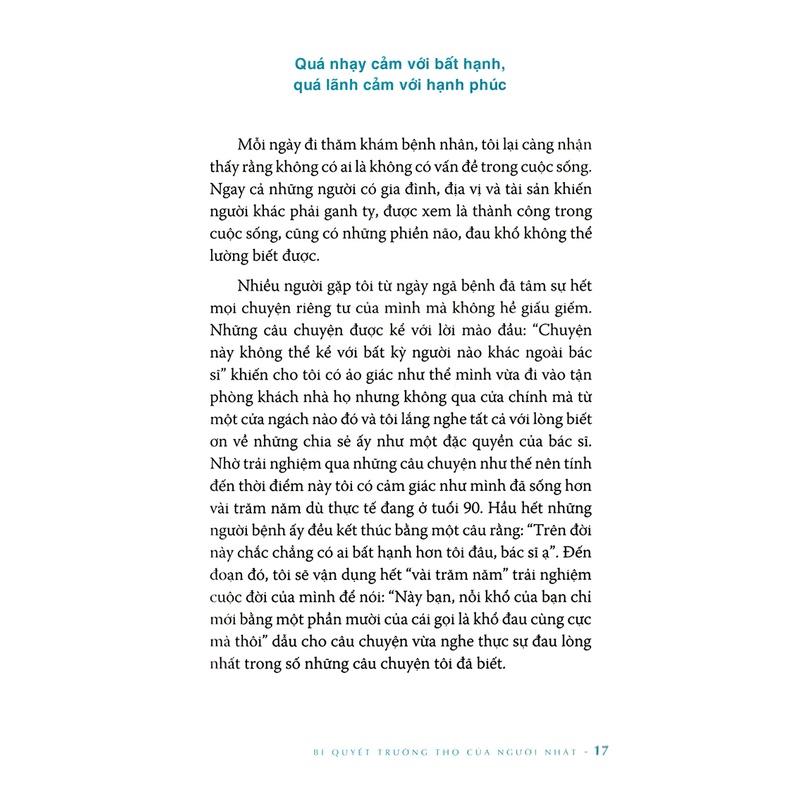 Vậy theo bạn thì thế nào là trường thọ? Nhiều người sẽ trả lời đó là những con số, như sống đến 100 tuổi chính là trường thọ. Thực ra chúng ta vốn luôn chạy theo những tiêu chuẩn mà không nhận ra “tiêu chuẩn không mang tính tuyệt đối”. Bằng những tiến bộ về y học như hiện nay thì tuổi thọ con người ngày càng được kéo dài. Cố bác sĩ Shigeaki Hinohara – huyền thoại y học Nhật Bản, đã viết: “Tôi cho rằng lấy ranh giới tuổi 70 để định nghĩa về người cao tuổi như hiện nay sẽ trở thành 75 tuổi vào thời điểm 20 năm sau”.
