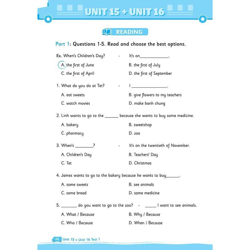 Cứ hai bài sẽ có 2 bài kiểm tra, tất cả các bài kiểm tra đều được thiết kế theo quy định thông tư mới nhất về kiểm tra môn Tiếng Anh tiểu học.