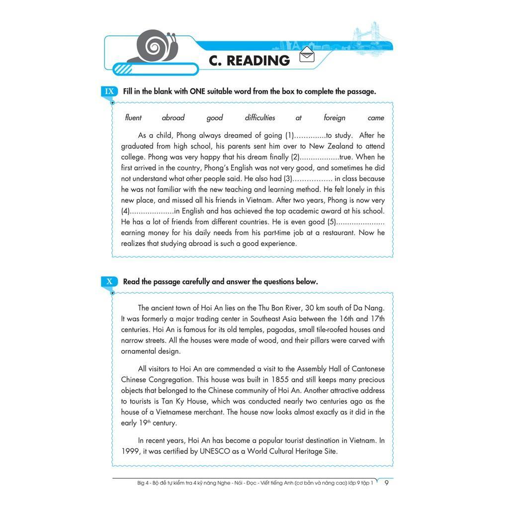 Big 4 Bộ Đề Tự Kiểm Tra 4 Kỹ Năng Nghe – Nói – Đọc – Viết (Cơ Bản và Nâng Cao) Tiếng Anh Lớp 9 Tập 1 viết theo chuẩn khung chương trình mới của Bộ Giáo Dục và Đào Tạo giúp các em học sinh lớp 9 củng cố và phát triển toàn diện các kỹ năng: Nghe – Nói – Đọc – Viết Tiếng Anh.