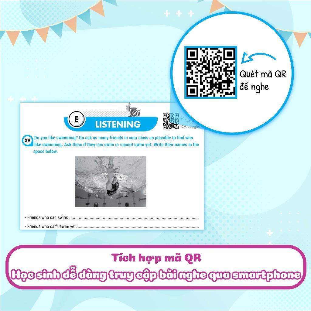 - File nghe QR code hiện đại và tiện dụng Một điểm đặc biệt của bộ sách đó là tính hiện đại và sự tiện dụng khi các em không cần sử dụng CD để có được bài nghe. Bộ sách được tích hợp mã QR và mã Code giúp các em dễ dàng có được file nghe chỉ với 1 chiếc smartphone, giúp rút ngắn thời gian tìm file