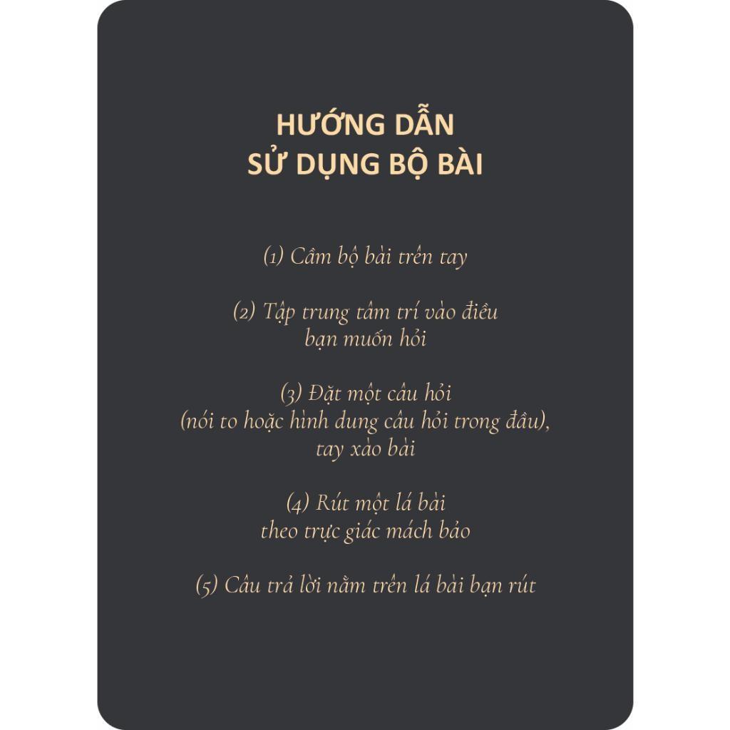 - 54 lá bài đáp án và 1 lá bài hướng dẫn Ngôn ngữ: tiếng Việt & tiếng Anh Hướng dẫn sử dụng: (1) Cầm bộ bài trên tay (2) Tập trung tâm trí vào điều bạn muốn hỏi. (3) Đặt một câu hỏi (nói to hoặc hình dung câu hỏi trong đầu), tay xáo bài (4) Rút một lá bài theo trực giác mách bảo (5) Câu trả lời nằm trên lá bài bạn rút