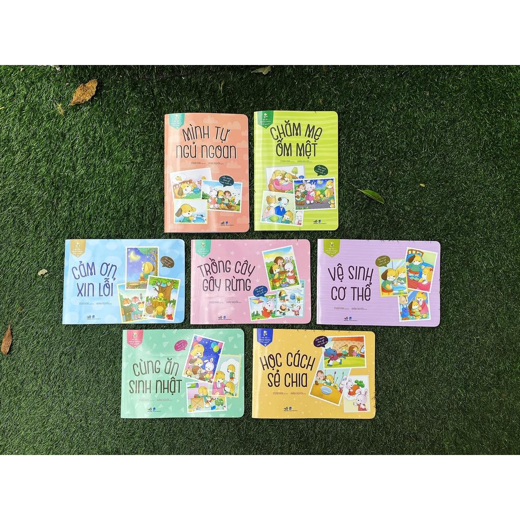 Bộ sách gồm 7 cuốn, đề cập đến 7 khía cạnh xoay quanh cuộc sống của mỗi em bé. Nào là dạy bé cách tự ngủ ngoan và chăm sóc mình hằng ngày, nào là dạy bé biết cách cảm ơn và xin lỗi, nào là để bé biết tự vệ sinh cơ thể như tắm rửa và đánh răng, nào là dạy bé chăm sóc bố mẹ khi ốm mệt, nào là dạy bé cách ăn uống đúng cách như cùng ăn sinh nhật với bạn bè, nào là dạy bé cách sẻ chia đồ chơi và đồ dùng với bạn, nào là dạy bé vui chơi ngoài thiên nhiên và vun trồng cây cối.