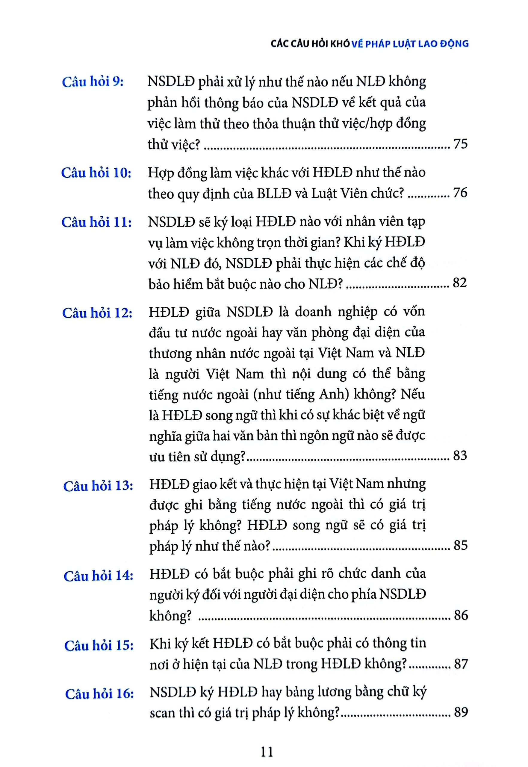 Cuốn sách Các câu hỏi khó về pháp luật lao động là một quyển sách không thể thiếu dành cho những người hành nghề luật nói chung và những người làm công tác nhân sự trong doanh nghiệp nói riêng, quyển sách tập hợp những câu hỏi khó, thường không dễ tìm thấy câu trả lời chính xác và rõ ràng trong các văn bản pháp luật, đòi hỏi sự tham khảo và phân tích tinh tế từ nhiều nguồn khác nhau. Đối với những câu hỏi quá phức tạp, tác giả đã dựa vào kinh nghiệm thực tế của mình cùng với các hướng dẫn không chính thức từ các chuyên viên quản lý lao động ở các cấp Trung ương và địa phương để soạn ra các câu trả lời phù hợp nhất tại từng thời điểm