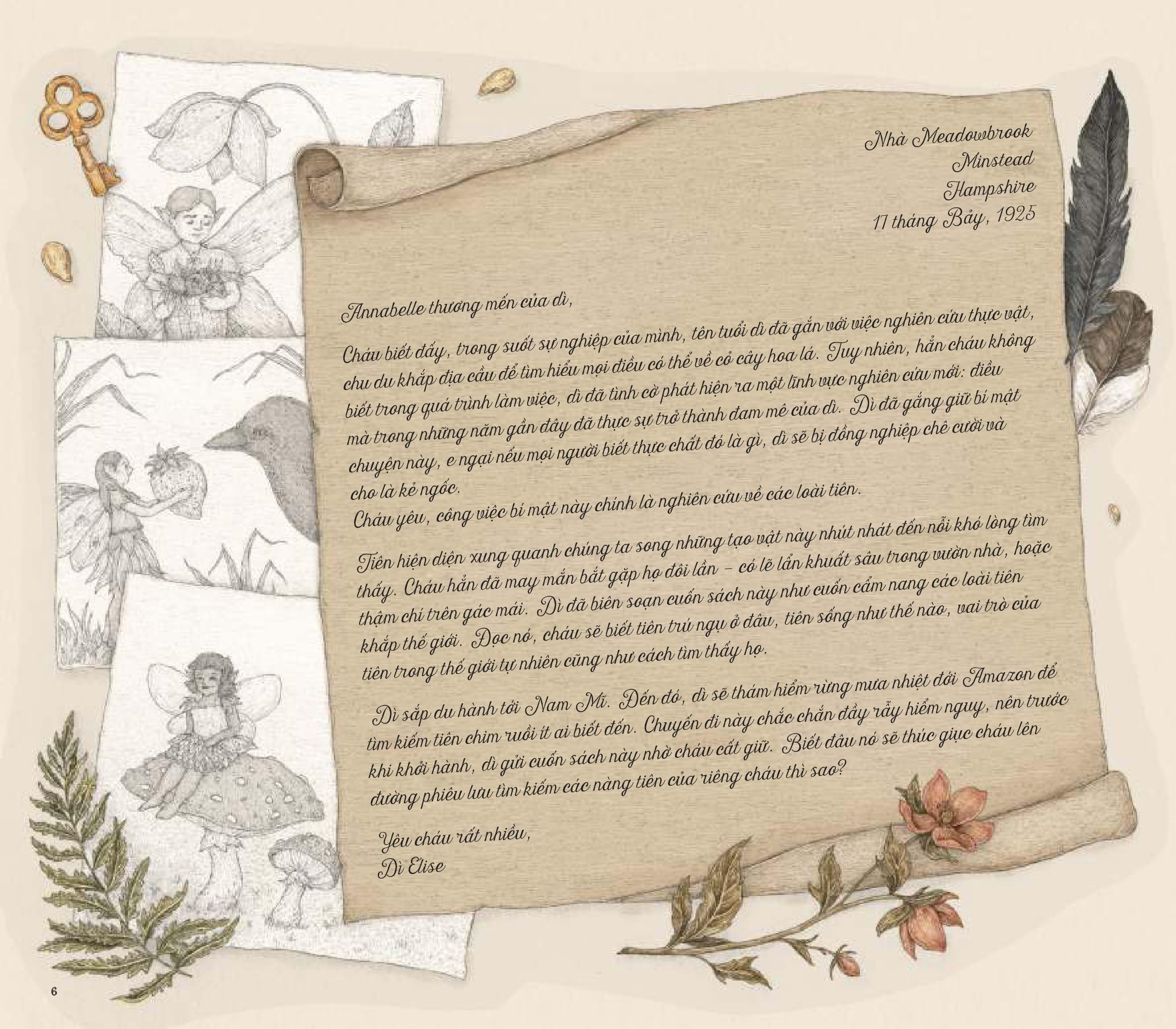 Cẩm Nang Về Tiên Bạn đọc thân mến, Bạn đã sẵn sàng cho chuyến hành trình có một không hai chưa? Vậy hãy lật giở cuốn sách này ngay thôi nào! Tiên có thật và hiện diện quanh ta, chỉ cần bạn nhanh trí, tinh mắt và đủ may mắn để trông thấy những tạo vật kì diệu này trong vườn nhà hay trên gác xép mà thôi. Biên soạn bởi nhà thực vật học lẫy lừng – Giáo sư Elsie Arbour, cuốn cẩm nang kì công này được bà gửi tới cháu gái nhằm giúp cô khám phá đời sống bí mật của các loài tiên cũng như vai trò của họ trong thế giới tự nhiên. Tập hợp nhiều ghi chú thực địa chính xác và minh họa cầu kì, từng trang sách tiết lộ đa dạng các loài tiên khác nhau trên khắp đ.ịa cầu, đi sâu phân tích đặc điểm nhận dạng, môi trường sống, tập tính và cả ngôn ngữ bí ẩn của họ. Bạn chắc chắn sẽ phải kinh ngạc trước thế giới các loài tiên siêu sống động và thú vị đấy!