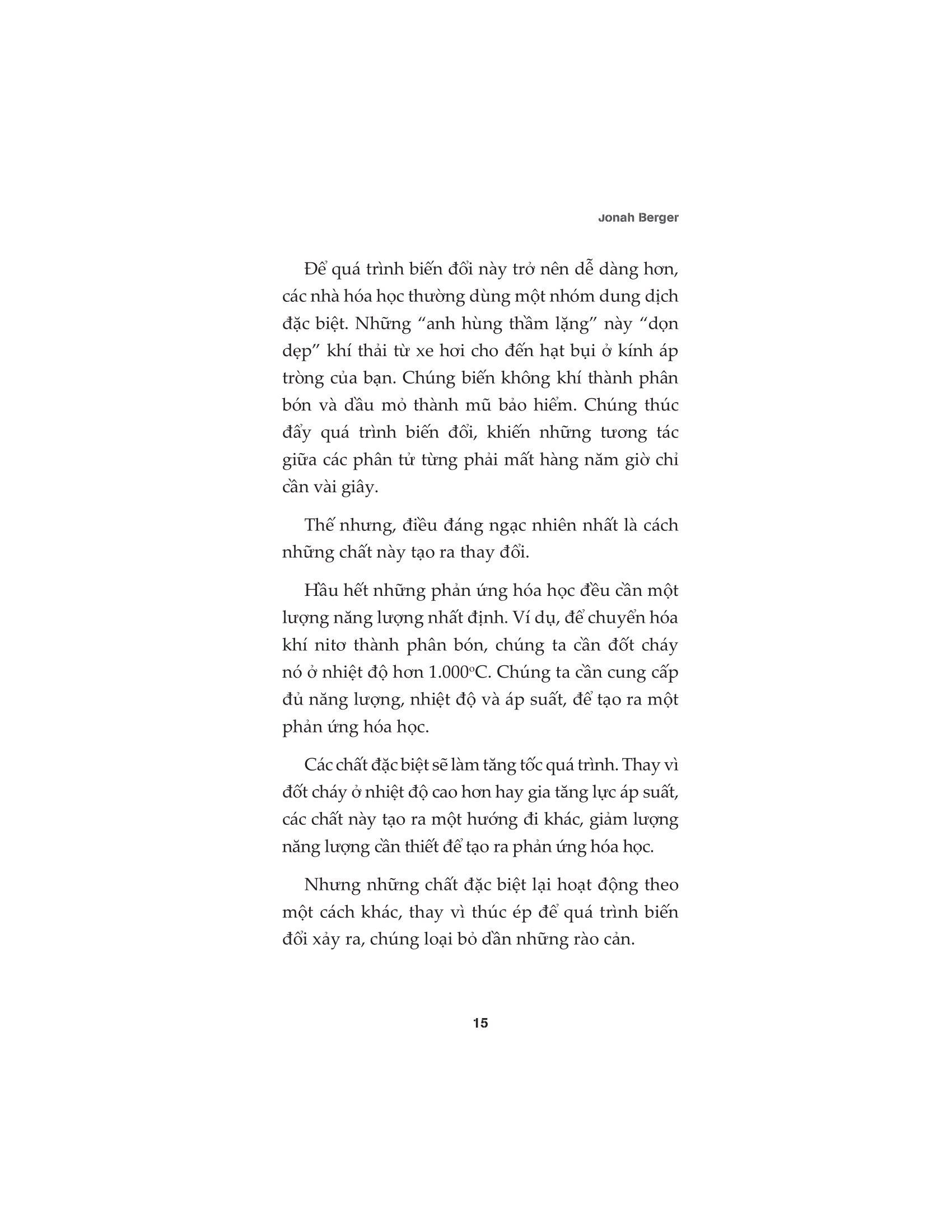 Chất Xúc Tác Thay Đổi Tâm Trí Bất Kỳ Ai Mỗi người đều có thứ họ muốn thay đổi. Người bán hàng muốn thay đổi suy nghĩ của người mua. Nhân viên muốn thay đổi góc nhìn của sếp, lãnh đạo thì muốn thay đổi cả tổ chức. Phụ huynh muốn thay đổi cách hành xử của con cái… Thế nhưng để thay đổi thì không hề dễ dàng. Trong cuốn “Chất xúc tác thay đổi tâm trí bất kỳ ai” Jonah Berger chỉ ra những cách thức giúp đẩy nhanh quá trình thay đổi, không phải thúc ép mà loại bỏ rào cản ngăn sự thay đổi xảy ra. Xuyên suốt cuốn sách này, người đọc thấy được các phương pháp hiệu quả nhất để thay đổi. Hiểu được làm cách nào, khi nào và tại sao con người lại xoay chuyển niềm tin của họ, thay đổi hành động, tiếp nhận những quan điểm mới mẻ và khác biệt hơn. Bạn sẽ hiểu được rằng tại sao những chấn thương nghiêm trọng thì nhanh hồi phục hơn so với những vết thương nhỏ. Tại sao giá trị tiềm năng phải nhiều hơn ít nhất 2,6 lần rủi ro tiềm tàng thì mới thuyết phục được khách hàng tham gia đặt cược… Và bạn cũng sẽ học được cách để cấp trên ủng hộ ý kiến của m.ình, thuyết phục được khách hàng mua sản phẩm. Chỉ cần đóng vai một chất xúc tác và cố gắng giảm bớt các vật cản, thì chính bạn, cũng có thể thay đổi suy nghĩ của bất cứ ai. Về tác giả: Jonah Berger là một giáo sư chuyên ngành marketing tại trường Wharton thuộc Đại học Pennsylvania và cũng là tác giả nổi tiếng toàn cầu. Ông cũng là một chuyên gia nổi tiếng thế giới trong lĩnh vực thay đổi hành vi, ảnh hưởng xã hội và marketing truyền miệng. Hơn 50 bài báo của ông đã được đăng trên các tạp chí học thuật hàng đầu và các ghi chép của ông thường xuất hiện trên những ấn phẩm như New York Times, Wall Street Journal và cả Harvard Business Review. Berger được chọn để đưa ra lời khuyên cho những công ty như Google, Apple, Nike và cả Bill & Melinda Gates Foundation. Ông là một trong những người sáng tạo nhất trong lĩnh vực kinh doanh của tờ Fast Company và các tác phẩm của ông nhiều lần xuất hiện trong mục “các ý tưởng của năm” của The New York Times.