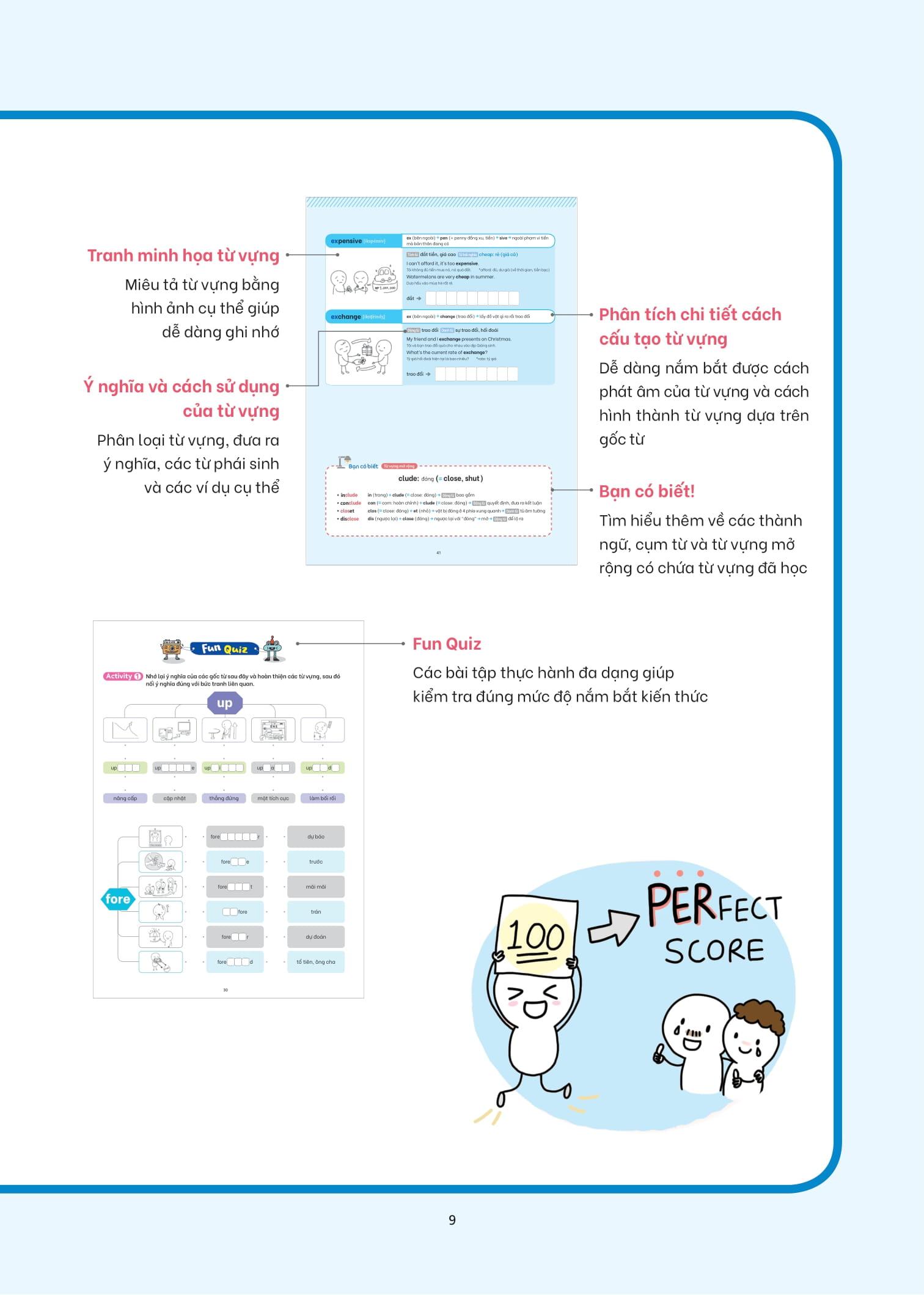 - Học từ vựng theo “gốc” – nắm chắc bản chất từ: Sách không chỉ đưa ra nghĩa mà phân tích chi tiết từng từ theo gốc – tiền tố – hậu tố, giúp bạn hiểu sâu và nhớ lâu, từ đó dễ dàng đoán nghĩa các từ mới liên quan mà không cần tra từ điển.
