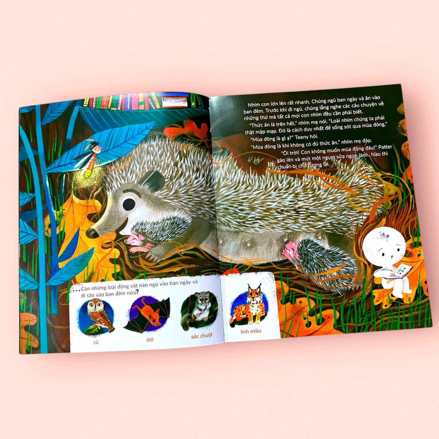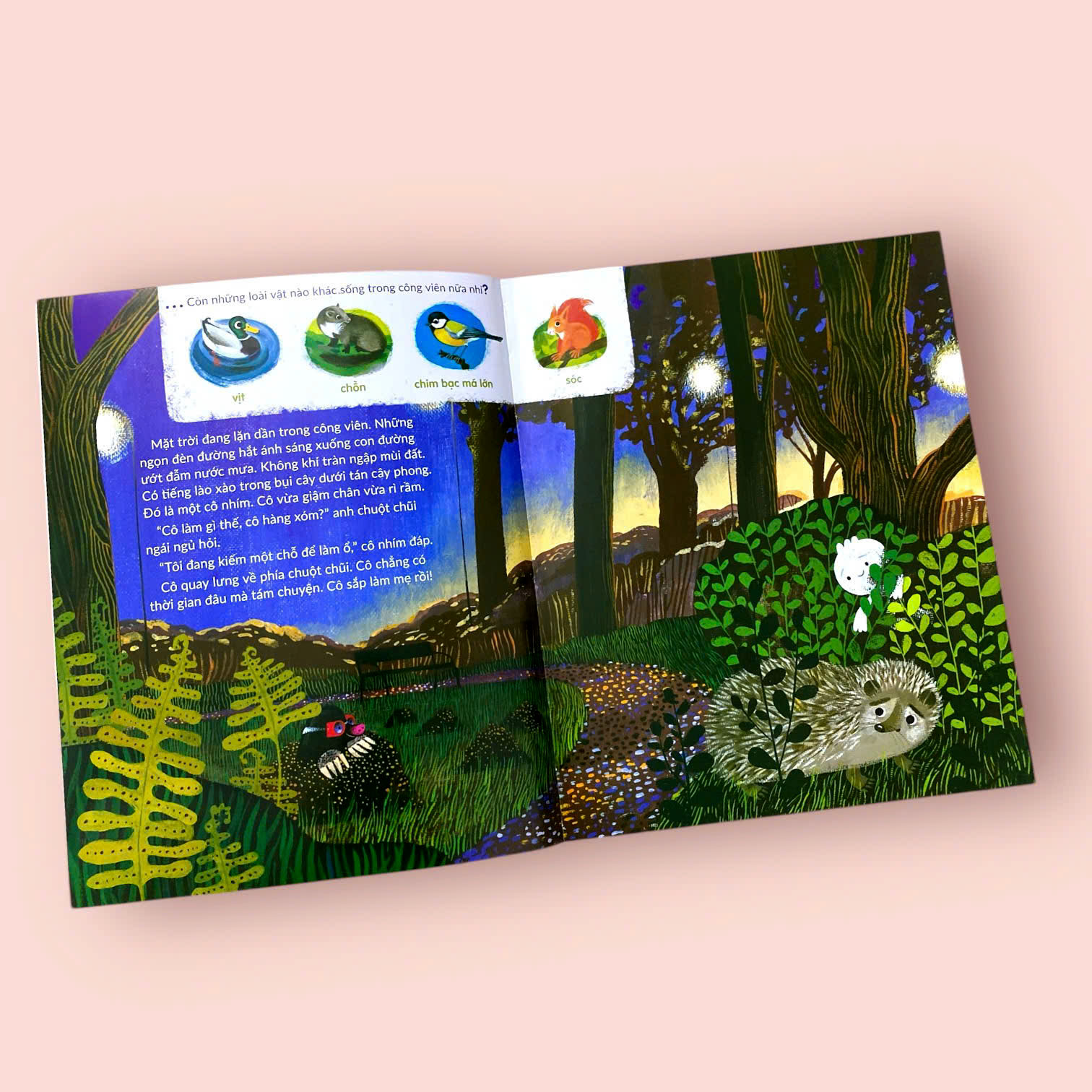 NHÀ NHÍM NƠI CÔNG VIÊN Ở cuốn sách này, sẽ đưa các bạn khám phá môi trường sống của gia đình nhím trong công viên - nơi ẩn chứa nhiều điều thú vị và bất ngờ. Các bạn sẽ được biết đến những thử thách mà hai anh em nhím Patter và Teeny phải đối mặt để sinh tồn trong thế giới đầy rẫy nguy hiểm. Chúng ta sẽ cùng tìm hiểu cách mẹ nhím chăm sóc con non, cách Teeny học hỏi những kỹ năng cần thiết để tự lập và chuẩn bị cho mùa đông khắc nghiệt. Với những bức tranh minh họa sinh động và đẹp mắt, cuốn sách không chỉ khơi gợi trí tưởng tượng và sự tò mò của các bạn nhỏ mà còn mang đến những kiến thức bổ ích về thói quen và lối sống của loài nhím. Qua đó, các bạn sẽ hiểu hơn về thế giới tự nhiên và thêm trân trọng sự đa dạng sinh học của Trái Đất.