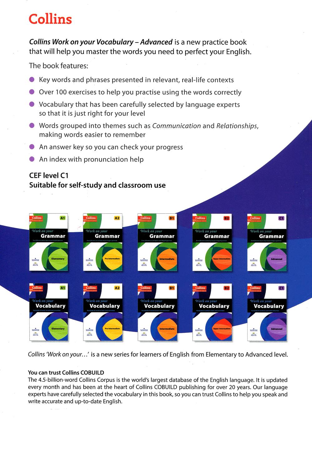 Hundreds of words to learn and rememberCollins Work On Your Vocabulary - Advanced C1 is a new practice book that covers the key vocabulary needed by learners of English at Advanced level (CEF level C1).