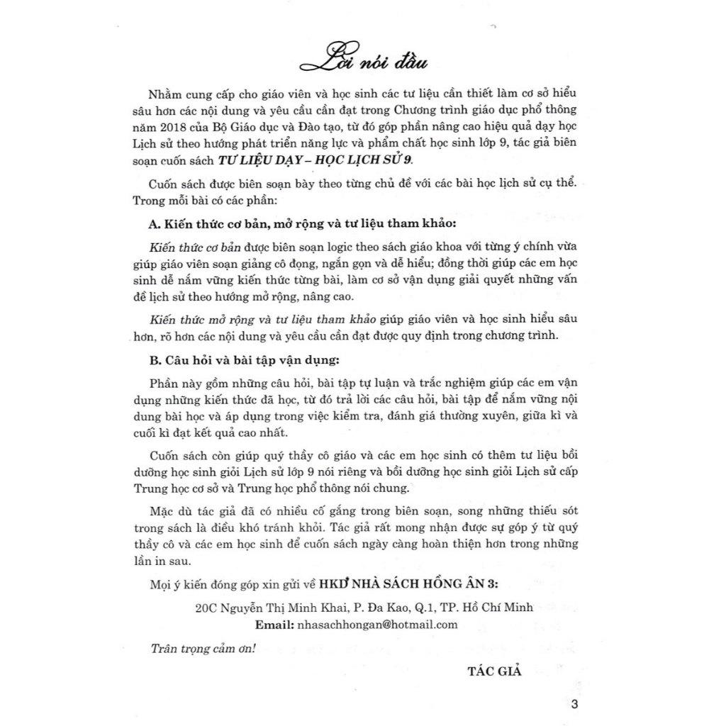 - Tư Liệu Dạy - Học Lịch Sử 9 (Dùng Chung Cho Các Bộ SGK Hiện Hành) Sách TƯ LIỆU DẠY - HỌC ĐỊA LÍ 9 được biên soạn nhằm cung cấp cho giáo viên và học sinh các tư liệu cần thiết làm cơ sở hiểu sâu hơn các nội dung và yêu cầu cần đạt trong Chương trình giáo dục phổ thông môn Lịch sử và Địa lí, phần Địa lí góp phần nâng cao hiệu quả dạy học Địa lí phát triển phẩm chất và năng lực học sinh. Sách được biên soạn theo Chương trình giáo dục phổ thông môn Lịch sử và Địa lí (cấp Trung học cơ sở) (Ban hành kèm theo Thông tư số 32/2018/TT-BGD ĐT ngày 26 tháng 12 năm 2018 của Bộ trưởng Bộ Giáo dục và Đào tạo). Sách được trình bày theo các chủ đề nội dung của Chương trình. Nội dung sách gồm một số tư liệu cần thiết giúp bổ sung, làm sáng rõ hoặc cụ thể hoá các nội dung dạy – học địa lí dân cư, địa lí ngành kinh tế và sự phân hoá lãnh thổ Việt Nam theo chương trình phân môn Địa lí lớp 9 THCS. Các tư liệu chủ yếu được lấy từ các sách, tạp chí, bài báo nghiên cứu khoa học, sách/ bài báo phổ biến kiến thức khoa học,... của các nhà nghiên cứu, nhà giáo, nhà khoa học, nhà báo,... Chúng tôi rất mong được các tác giả cho phép và trân trọng bày tỏ lòng cảm ơn. Việc chọn lọc, tổng hợp và trình bày nội dung sách tham khảo địa lí theo chương trình mới, mặc dù các tác giả có nhiều nỗ lực nhưng chắc chắn không tránh khỏi những hạn chế, thiếu sót. Các tác giả rất mong nhận được những ý kiến đóng góp để cuốn sách được hoàn thiện, phục vụ thiết thực hơn hoạt động dạy và học ở nhà trường.
