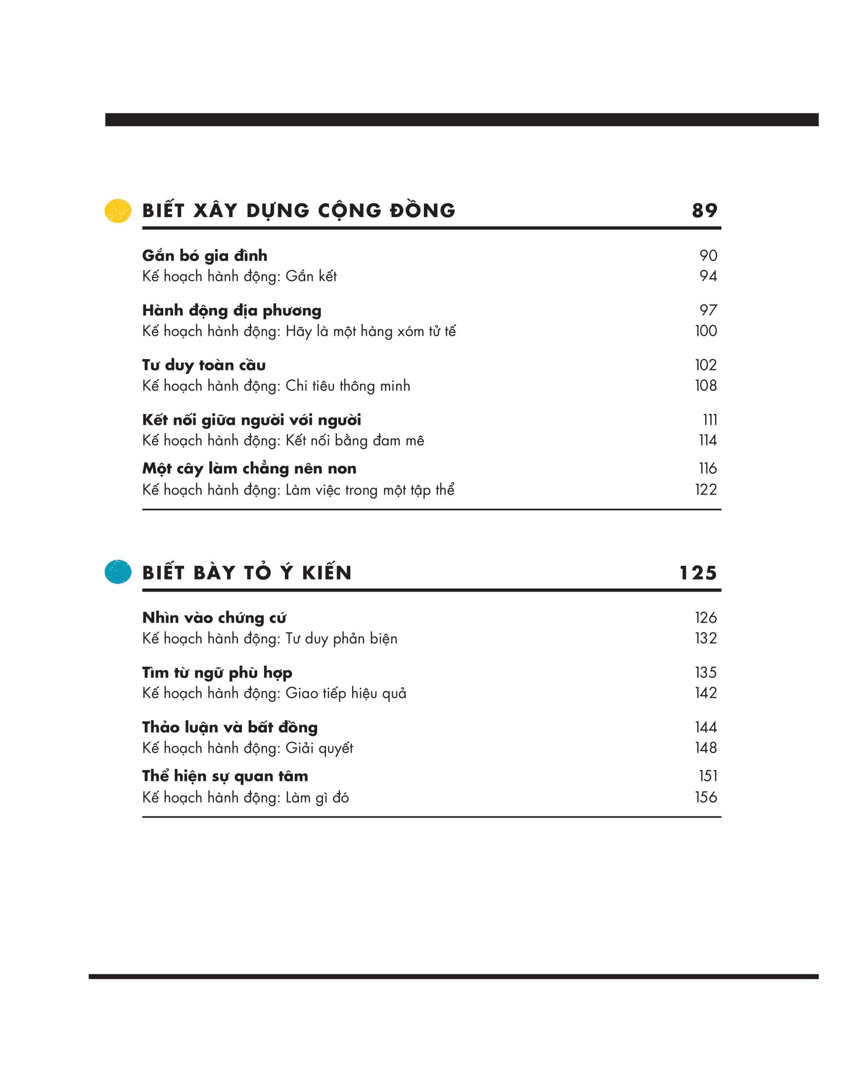 - Nội dung chính: Sách gồm 6 chương, mỗi chương đề cập đến một khía cạnh khác nhau của việc nuôi dạy trẻ trong thế kỉ 21; trong đó mỗi người góp chữ sẽ chia sẻ một góc nhìn độc đáo của riêng m.ình; cuối mỗi phần nhỏ là mục Kế hoạch hành động cung cấp các ý tưởng và hướng dẫn chi tiết để độc giả có thể thực hành cùng con: Chương 01 – Biết yêu hành tinh này Chương 02 – Biết làm bạn Chương 03 – Biết xây dựng cộng đồng Chương 04 – Biết bày tỏ ý kiến Chương 05 – Biết chơi cùng nhau Chương 06 – Biết cùng khám phá
