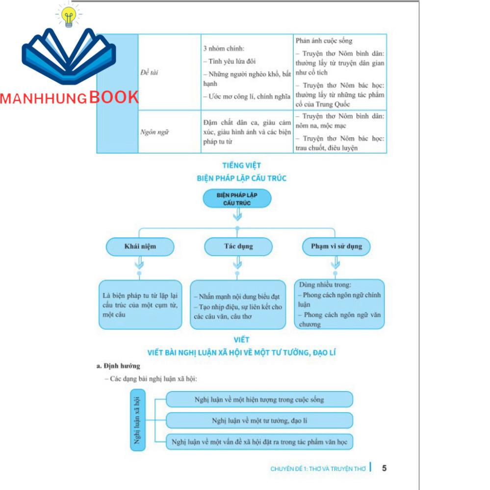 – Phần một: Tóm tắt kiến thức trọng tâm của các bài học một cách ngắn gọn, cô đọng bằng các từ khoa, bảng biểu, sơ đồ. Các kiến thức trong SGK được trình bày theo bài hoặc chủ đề, đầy đủ các phần đọc, viết, tri thức tiếng Việt và văn học. Các phần kiến thức cốt lõi được trình bày, diễn giải cô đọng, hệ thống và đầy đủ; người học có thể nhớ, hiểu rõ về các đơn vị kiến thức và vận dụng giải quyết các nhiệm vụ học tập và các tình huống thực tiễn. Các chuyên đề của lớp 11 được hướng dẫn cả phần lí thuyết và thực hành để học sinh chủ động nắm vững kĩ năng và hoàn thành các sản phẩm học tập.