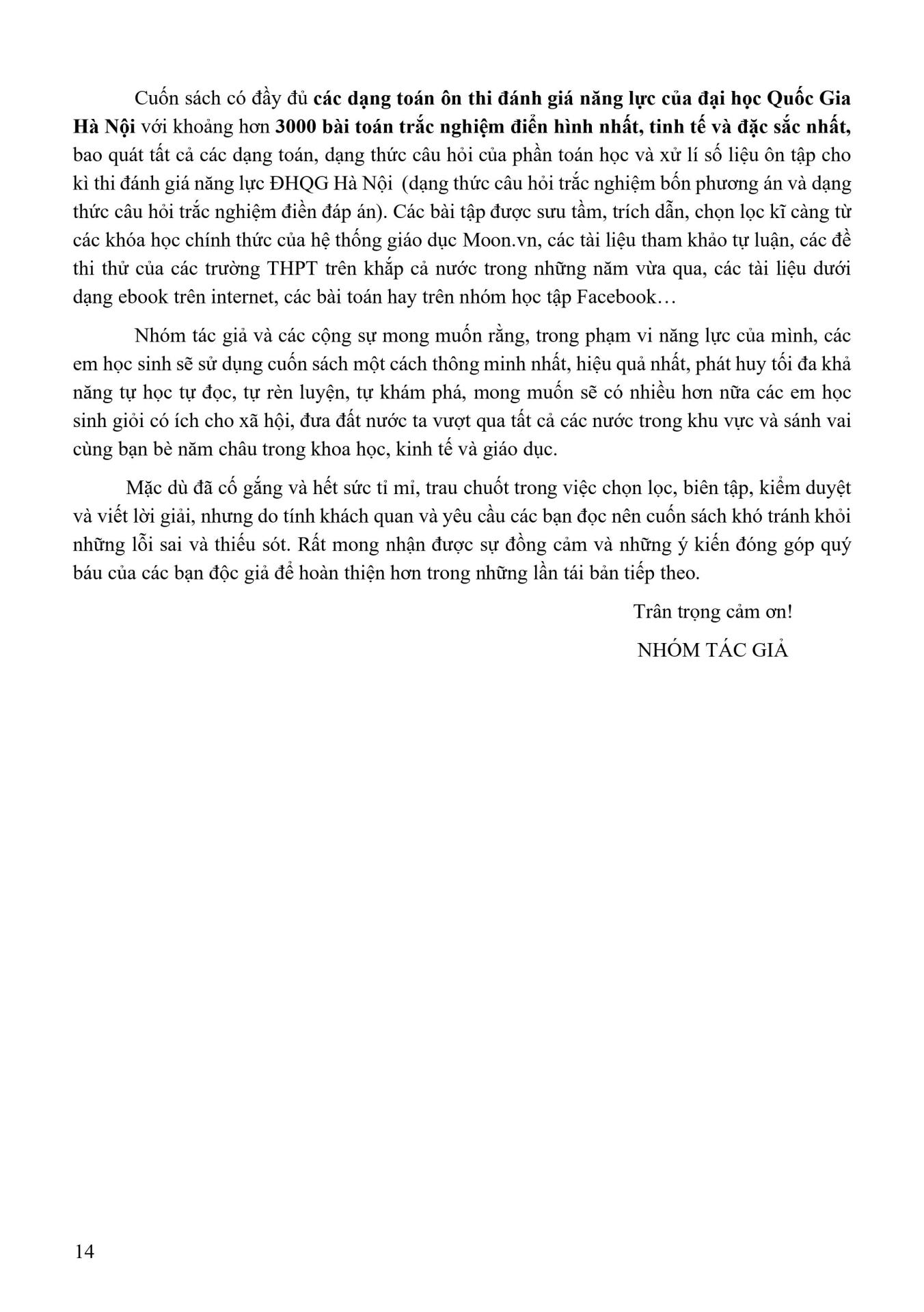 Cuốn sách có đầy đủ các dạng toán ôn thi đánh giá năng lực của đại học Quốc Gia Hà Nội với khoảng hơn 3000 bài toán trắc nghiệm điển hình nhất, tinh tế và đặc sắc nhất, bao quát tất cả các dạng toán, dạng thức câu hỏi của phần toán học và xử lí số liệu ôn tập cho kì thi đánh giá năng lực ĐHQG Hà Nội (dạng thức câu hỏi trắc nghiệm bốn phương án và dạng thức câu hỏi trắc nghiệm điền đáp án). Các bài tập được sưu tầm, trích dẫn, chọn lọc kĩ càng từ các khóa học chính thức của hệ thống giáo dục , các tài liệu tham khảo tự luận, các đề thi thử của các trường THPT trên khắp cả nước trong những năm vừa qua, các tài liệu dưới dạng ebook trên internet, các bài toán hay trên nhóm học tập