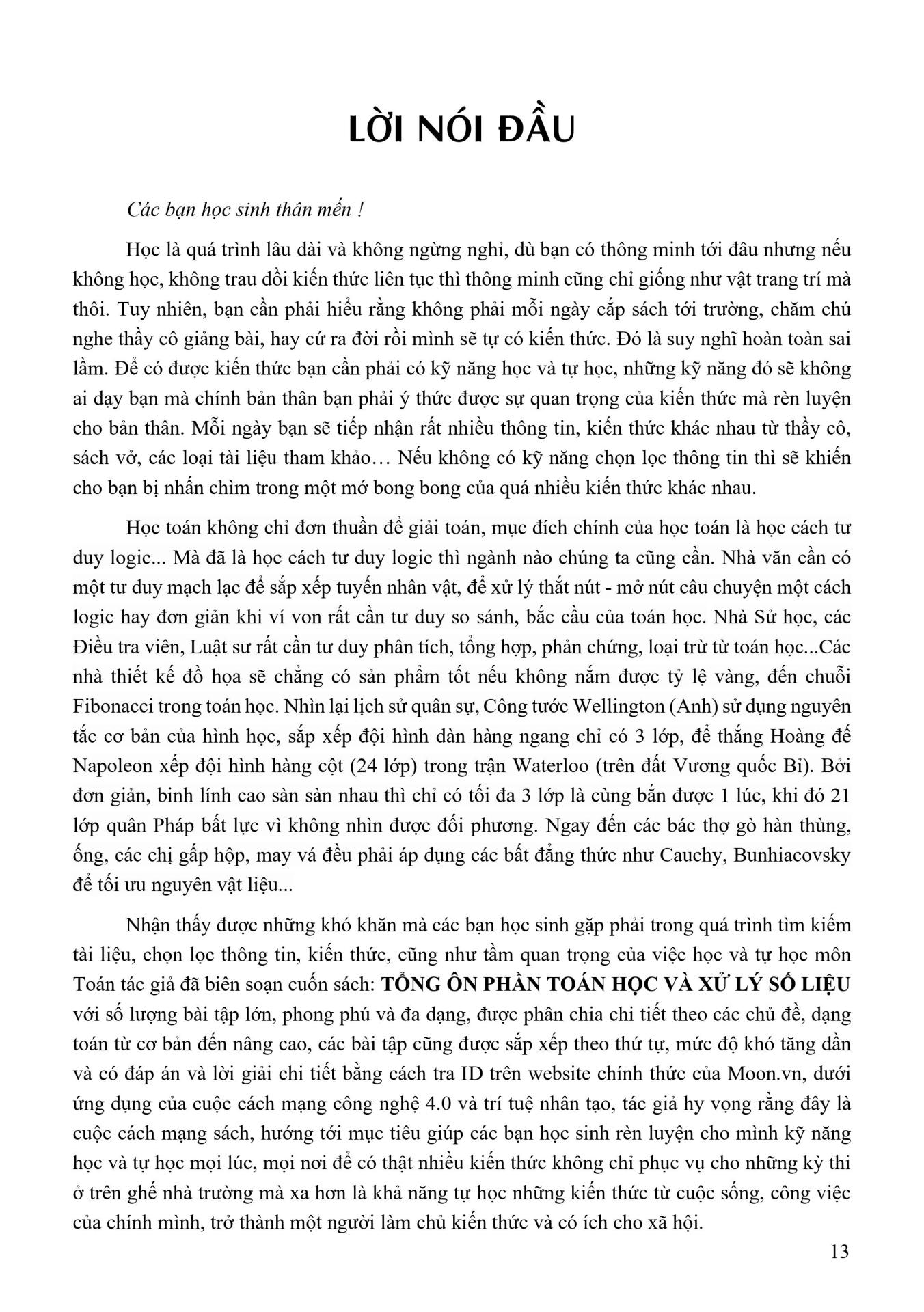 Với số lượng bài tập lớn, phong phú và đa dạng, được phân chia chi tiết theo các chủ đề, dạng toán từ cơ bản đến nâng cao, các bài tập cũng được sắp xếp theo thứ tự, mức độ khó tăng dần và có đáp án và lời giải chi tiết bằng cách tra ID trên website chính thức của , dưới ứng dụng của cuộc cách mạng công nghệ 4.0 và trí tuệ nhân tạo, tác giả hy vọng rằng đây là cuộc cách mạng sách, hướng tới mục tiêu giúp các bạn học sinh rèn luyện cho m.ình kỹ năng học và tự học mọi lúc, mọi nơi để có thật nhiều kiến thức không chỉ phục vụ cho những kỳ thi ở trên ghế nhà trường mà xa hơn là khả năng tự học những kiến thức từ cuộc sống, công việc của chính m.ình, trở thành một người làm chủ kiến thức và có ích cho xã hội.