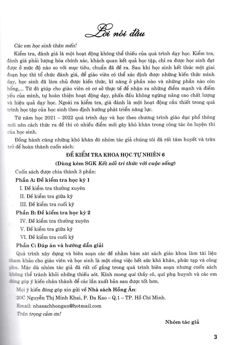 Kiểm tra, đánh giá là một hoạt động không thể thiếu của quá trình dạy học. Kiểm tra, đánh giá phải lượng hóa chính xác, khách quan kết quả học tập, chỉ ra được học sinh đạt được ở mức độ nào so với mục tiêu, chuẩn đã đề ra. Sau khi học sinh kết thúc một giai đoạn học thì tổ chức đánh giá, để giáo viên có thể xác định được những kiến thức mình dạy, học sinh đã làm chủ được kiến thức, kĩ năng ở phần nào và những phần nào còn hổng, Từ đó giúp cho giáo viên có cơ sở thực tế để nhận ra những điểm mạnh và điểm yếu của mình, tự hoàn thiện hoạt động dạy, phấn đấu không ngừng nâng cao chất lượng và hiệu quả dạy học. Ngoài ra kiểm tra, đánh giá là một hoạt động cần thiết trong quá trình học tập của học sinh theo định hướng phát triển năng lực. Từ năm học 2021 – 2022 quá trình dạy và học theo chương trình giáo dục phổ thông mới nên cách thức ra đề thi có nhiều điểm mới gây khó khăn trong công tác ôn luyện thi của học sinh. Đồng hành cùng những khó khăn đó nhóm tác giả chúng tôi đã rất tâm huyết và trăn trở để hoàn thành cuốn sách: ĐỀ KIỂM TRA KHOA HỌC TỰ NHIÊN 6 (Dùng kèm SGK Kết nối tri thức với cuộc sống) Cuốn sách được chia thành 3 phần: Phần A: Đề kiểm tra học kỳ 1 I. Đề kiểm tra thường xuyên II. Đề kiểm tra giữa kỳ III. Đề kiểm tra cuối kỳ Phần B: Đề kiểm tra học kỳ 2 IV. Đề kiểm tra thường xuyên V. Đề kiểm tra giữa kỳ VI. Đề kiểm tra cuối kỳ Phần C: Đáp án và hướng dẫn giải