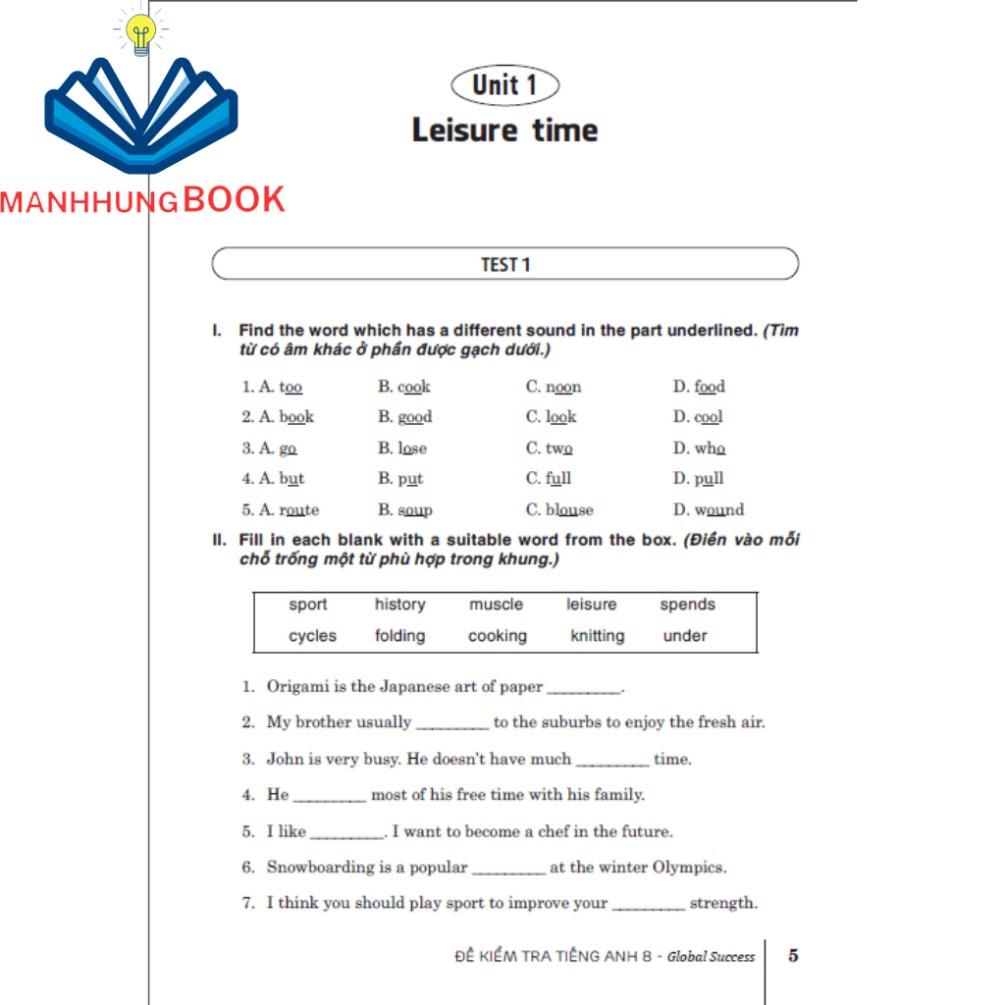 Cuốn sách “Đề kiểm tra tiếng Anh 8” được biên soạn bám sát sách giáo khoa Tiếng Anh 8 thuộc bộ Kết nối tri thức với cuộc sống (Global Success) nhằm mục đích giúp các em học sinh nhanh chóng nắm bắt những điểm đổi mới trong chương trình học nói chung, đồng thời làm quen với cách giải các đề kiểm tra môn Tiếng Anh 8 một cách chuẩn xác.