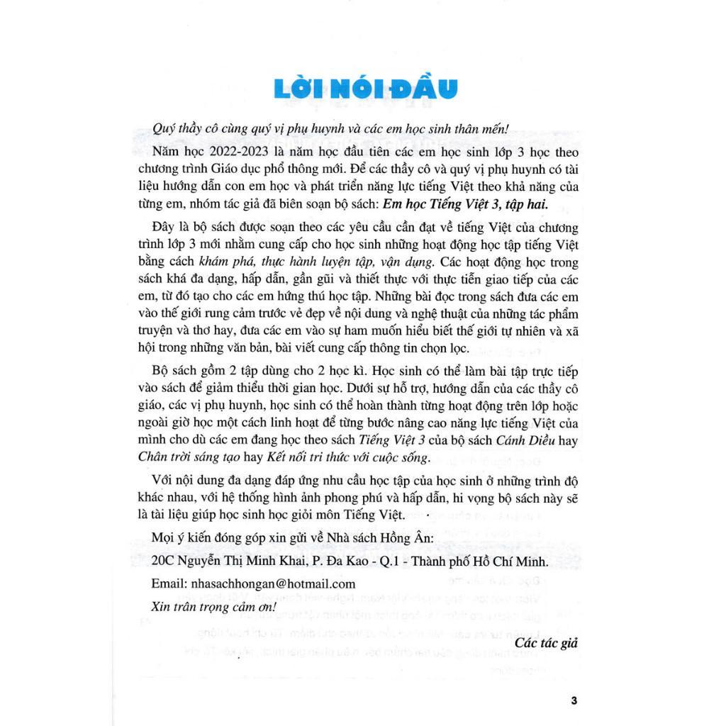 Năm học 2022-2023 là năm học đầu tiên các em học sinh lớp 3 học theo chương trình Giáo dục phổ thông mới. Để các thầy cô và quý vị phụ huynh có tài liệu hướng dẫn con em học và phát triển năng lực tiếng Việt theo khả năng của từng em, nhóm tác giả đã biên soạn bộ sách: Em Học Tiếng Việt 3 (Biên Soạn Theo Chương Trình GDPT Mới).
