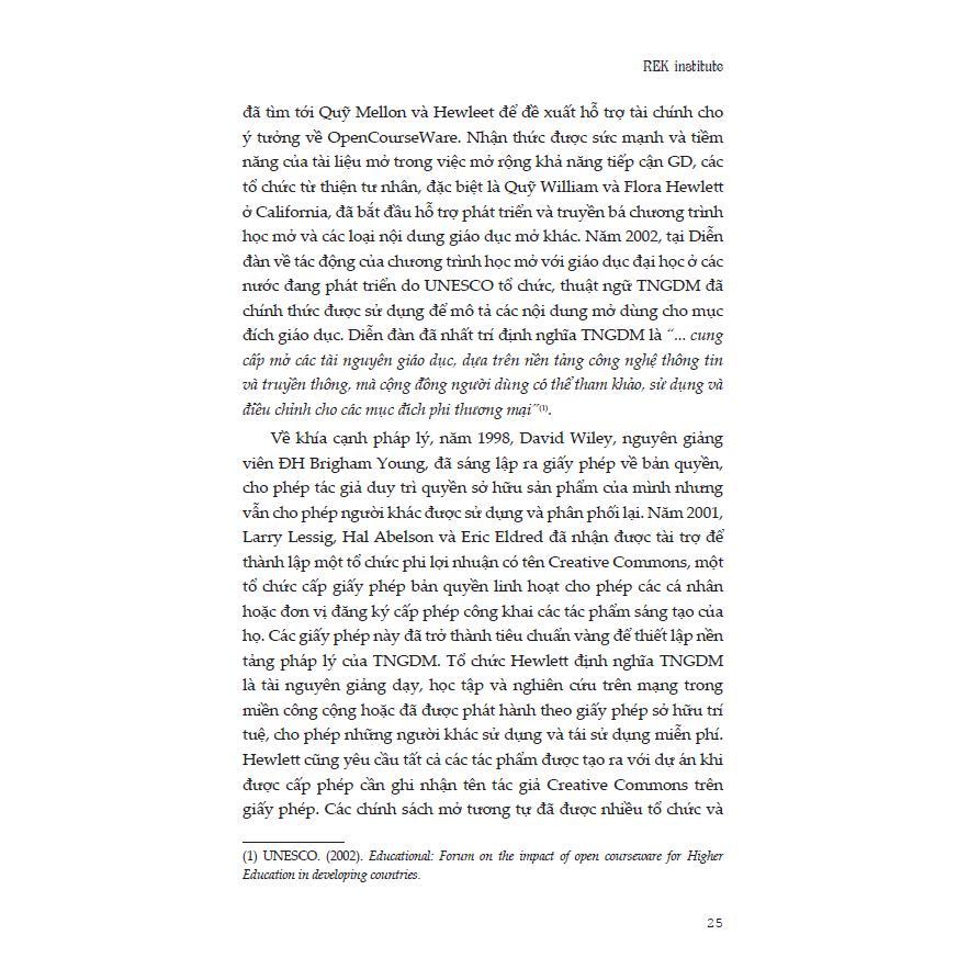 Ngoài ra, để đáp ứng nhu cầu của các cơ sở giáo dục và các tổ chức về việc giới thiệu, đào tạo, bồi dưỡng về giáo dục mở và khoa học mở, cuốn sách cũng cung cấp tại Phụ lục một đề cương khóa đào tạo ngắn ngày (4 buổi) về nội dung này.