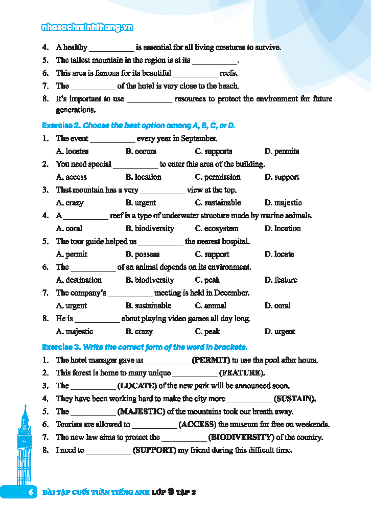 - Phần bài tập nâng cao: được thiết kế để đánh thức và phát triển kỹ năng tiếng Anh nâng cao của các em. Những bài tập ở phần này tập trung vào việc mở rộng vốn từ vựng, phát triển mạnh kiến thức ngữ pháp, rèn luyện kĩ năng đọc hiểu sâu và kĩ năng viết sáng tạo. Các em sẽ được khuyến khích tư duy linh hoạt và sáng tạo thông qua các hoạt động và bài tập đa dạng