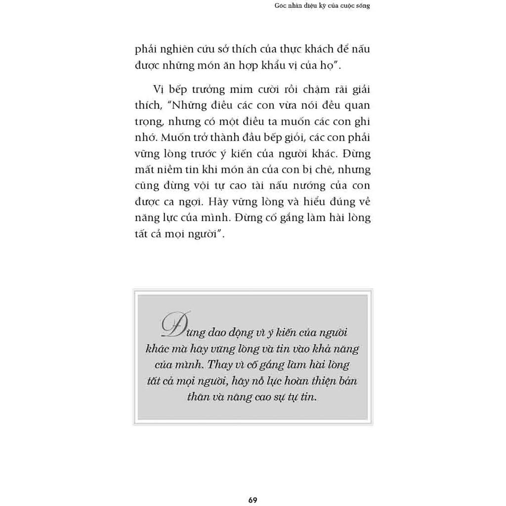 Mỗi câu chuyện trong “Góc Nhìn Diệu Kỳ Của Cuộc Sống” chứa đựng thông điệp mang nhiều tầng ý nghĩa, thể hiện nhiều cung bậc và sắc thái của bức tranh đa chiều về cuộc sống. Càng dành thời gian chiêm nghiệm những thông điệp mà quyển sách truyền tải, bạn sẽ càng có được cái nhìn toàn diện hơn về nhân sinh, từ đó càng hiểu hơn về bản thân. Hy vọng qua “Góc Nhìn Diệu Kỳ Của Cuộc Sống”, mỗi ngày bạn sẽ khám phá thêm những gam màu mới và sắc thái mới của những gam màu cũ để có thể nuôi dưỡng cảm xúc và tâm hồn mình, từ đó hiểu được rằng cuộc sống này vô cùng đặc biệt vì vừa đơn giản vừa phức tạp, vừa mới lạ vừa thân quen.