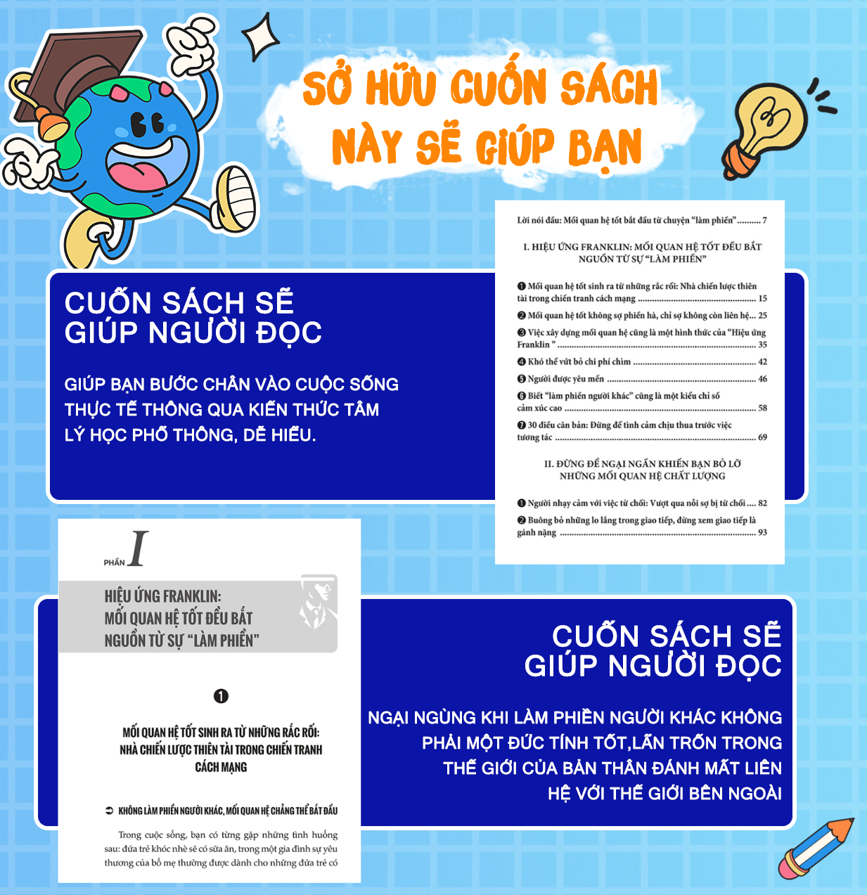 “Hiệu ứng Franklin - Mối quan hệ tốt bắt nguồn từ sự làm phiền” sẽ giúp bạn bước chân vào cuộc sống thực tế thông qua kiến thức tâm lý học phổ thông, dễ hiểu, là một sổ tay về giao tiếp xã hội mà bất kì ai cũng có thể đọc hiểu. Rồi bạn sẽ nhận ra, ngại ngùng khi làm phiền người khác không phải một đức tính tốt, lẩn trốn trong thế giới của bản thân đánh mất liên hệ với thế giới bên ngoài. Mối quan hệ tốt bắt đầu từ chuyện “làm phiền”. Sống ở đời, không thể lúc nào cũng đơn phương độc mã. Biết cách làm phiền người khác là một biểu hiện của EQ cao, cũng là một hình thức khiến đôi bên cảm nhận được sự ấm áp, cảm nhận được giá trị của nhau. Mong tất cả chúng ta đều học được cách mở lòng và nhờ vả người khác một cách đúng đắn.