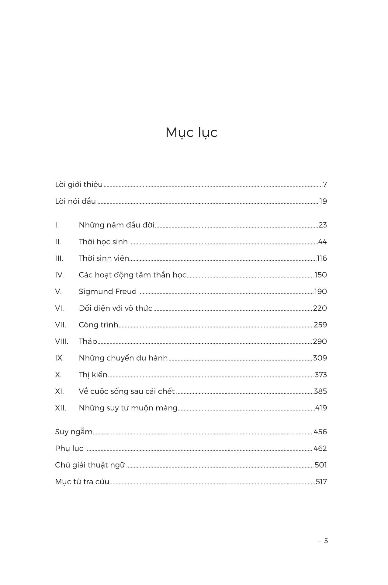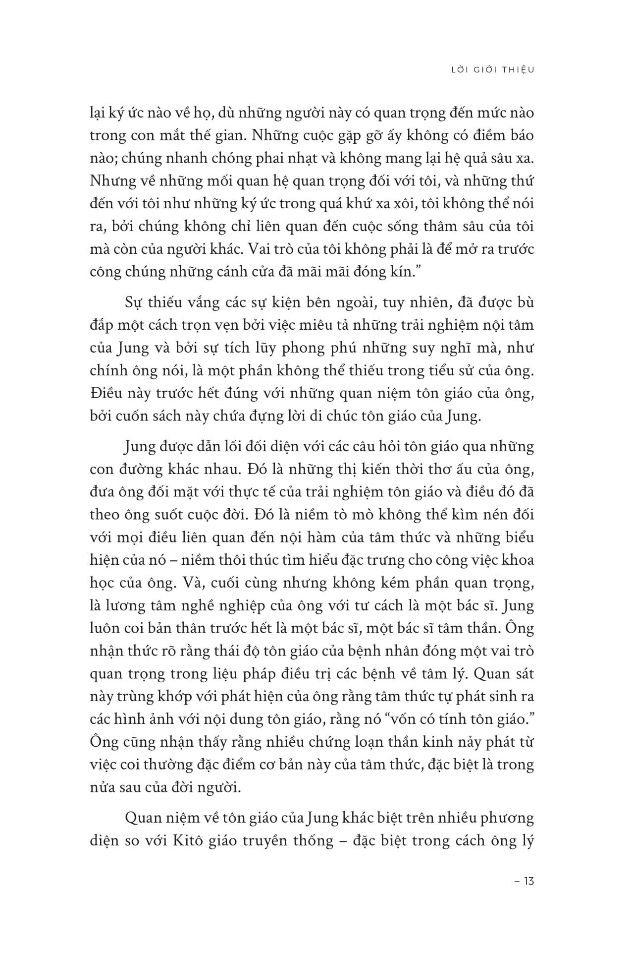 BỐ CỤC CUỐN SÁCH: Lời giới thiệu Lời nói đầu I. Những năm đầu đời II. Thời học sinh III. Thời sinh viên IV. Các hoạt động tâm thần học V. Sigmund Freud VI. Đối diện với vô thức VII. Công trình VIII. Tháp IX. Những chuyến du hành X. Thị kiến XI. Về cuộc sống sau cái chết XII. Những suy tư muộn màng Suy ngẫm Phụ lục Chú giải thuật ngữ Mục từ tra cứu THÔNG TIN TÁC GIẢ: Carl Gustav Jung (1875 – 1961) Nhà tâm lý học lớn, có ảnh hưởng sâu rộng đến nhiều lĩnh vực khoa học khác nhau. Ông là bác sĩ tâm thần tiên phong, người sáng lập ra trường phái Tâm lý học phân tích (còn gọi là Tâm lý học chiều sâu), một nhánh quan trọng được phát triển từ phân tâm học [của S. Freud], đồng thời cũng góp phần định hình lại cách chúng ta nhìn nhận về thần kinh học thông qua những khám phá về các khía cạnh tâm thức sâu xa. Jung nổi tiếng với các nghiên cứu về vô thức tập thể và nguyên mẫu, những khái niệm đã cách mạng hóa hiểu biết của chúng ta về bản chất con người, huyền thoại và biểu tượng. Sự nghiệp khoa học của ông tập trung vào quá trình cá nhân hóa, hành trình tìm kiếm sự toàn vẹn của bản thân, cũng như mối liên hệ giữa các truyền thống tâm linh cổ xưa với tâm lý học hiện đại. Tác phẩm nổi bật: Psychological Types (Các loại hình Tâm lý), 1921 Aion: Researches into the Phenomenology of the Self (Nghiên cứu về Hiện tượng học của cái Tôi toàn thể), 1951 Memories, Dreams, Reflections (Hồi ức, Giấc mơ, Suy ngẫm), 1961 Red Books (Sách Đỏ), 2009 TRÍCH ĐOẠN/ CÂU QUOTE HAY Dù là những cá nhân riêng biệt, con người chúng ta, ở một mức độ lớn, vẫn là đại diện, là nạn nhân và là tác nhân của một tinh thần tập thể có tuổi đời tính bằng thế kỷ. Ta có thể tưởng rằng suốt đời được tự làm theo ý m.ình, và có thể chẳng bao giờ nhận ra phần lớn thời gian ta chỉ là vai phụ trên sân khấu của vở kịch thế gian. Có những yếu tố, dù ta không biết đến, vẫn ảnh hưởng đến đời ta – và càng mạnh hơn nếu chúng nằm trong vô thức. — Chương III Tôi không có ý định, cũng chẳng đủ khả năng, để đứng ngoài bản thân và quan sát số phận của m.ình một cách thật sự khách quan. Nếu làm vậy, tôi sẽ phạm sai lầm thường thấy trong các hồi ký – hoặc dệt nên một ảo tưởng về cách lẽ ra mọi chuyện nên xảy ra, hoặc viết ra một lời biện hộ cho đời m.ình. Rốt cuộc, con người là một hiện tượng không thể tự phán xét m.ình, và việc này, dù tốt hay xấu, vẫn phải giao cho người khác nhận định. — Chương III Trong nhiều trường hợp tâm thần học, bệnh nhân đến với chúng tôi luôn mang theo một câu chuyện chưa từng được kể – và thường thì chẳng ai biết đến câu chuyện đó. Theo tôi, việc đ.iều trị thực sự chỉ có thể bắt đầu sau khi ta khám phá được câu chuyện cá nhân đó. Đó là bí mật của bệnh nhân, là tảng đá mà họ va phải và vỡ tan. Nếu tôi biết được câu chuyện bí mật ấy, tôi có trong tay chiếc chìa khóa để đ.iều trị. Nhiệm vụ của bác sĩ là tìm ra cách để đạt tới tri thức đó. Trong đa số trường hợp, chỉ khai thác phần ý thức là không đủ. Đôi khi một bài kiểm tra liên tưởng có thể mở đường; cũng có thể là việc giải mã giấc mơ, hoặc một mối quan hệ kiên nhẫn, lâu dài với bệnh nhân như giữa người với người. Trong đ.iều trị, vấn đề luôn luôn là con người toàn vẹn – không bao giờ chỉ là triệu chứng đơn lẻ. Chúng ta phải đặt ra những câu hỏi thách thức nhân cách toàn diện. — Chương IV Tâm thức phức tạp hơn và khó tiếp cận hơn cơ thể rất nhiều. Có thể nói rằng, nó là một nửa thế giới – nửa chỉ thực sự tồn tại khi ta nhận thức được nó. Vì lý do đó, tâm thức không chỉ là vấn đề cá nhân mà còn là vấn đề của cả thế giới, và nhà tâm thần học phải đối mặt với cả một thế giới. — Chương IV Với tôi, một chân lý khoa học là một giả thuyết có thể tạm thời xem là phù hợp, nhưng không bao giờ được coi là một giáo lý vĩnh cửu. — Chương V Rốt cuộc, người nghệ sĩ hiện đại luôn muốn sáng tạo nghệ thuật từ vô thức. — Chương VI [...] không có lịch sử thì không thể có tâm lý học – và chắc chắn là không thể có tâm lý học về vô thức. — Chương VII Cuộc đời tôi đã được xuyên thấu và gắn kết lại bởi một ý tưởng và một mục tiêu duy nhất: đó là đi sâu vào bí mật của nhân cách. Mọi thứ đều có thể được giải thích từ điểm trung tâm ấy, và tất cả các công trình của tôi đều liên quan đến chủ đề duy nhất này. — Chương VII Mọi phán đoán của một cá nhân đều chịu ảnh hưởng bởi kiểu nhân cách của anh ta, và rằng mọi quan điểm đều tất yếu là tương đối. — Chương VII Khi một nhà vật lý nói rằng nguyên tử có cấu tạo như thế này hay thế kia, và vẽ một mô hình về nó, ông ta không hề có ý nói ra một chân lý vĩnh cửu. Nhưng các nhà thần học lại không hiểu 