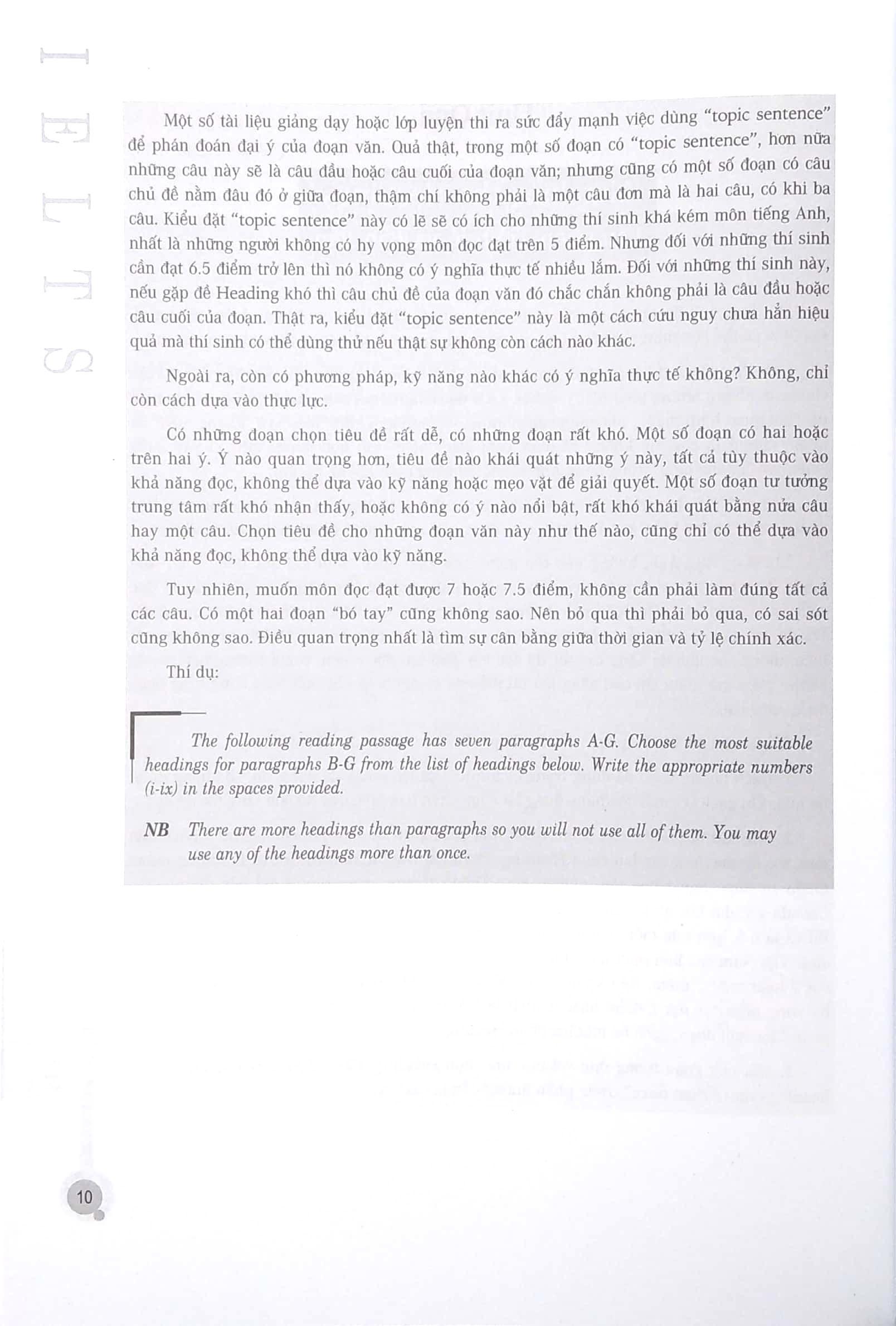 Bài đọc trong các kỳ thi IELTS khác với bài đọc tiếng Anh thường ngày và bài đọc trong các kỳ thi tiếng Anh khác. Thông thường, đọc là một phương thức thu thập thông tin, còn các bài đọc trong kỳ thi IELTS là thông qua việc đọc để giải quyết các vấn đề cụ thể. Nó cách khác, thông qua việc đọc để tìm ra đáp án của câu hỏi. Trong quá trình học và sử dụng tiếng Anh nhiều năm, các họ sinh phần nào hình thành các đọc riêng của m.ình. Những cách đọc này có lẽ rất hiệu quả trong học tập và công việc, nhưng khi áp dụng vào bài thi đọc IELTS có thể họ sẽ gặp khó khăn bởi các yếu tố như thời gian có hạn, dạng đề đặc biệt …. Vì vậy, tác giả đề nghị khi làm bài tập trong cuốn sách này, trước hết phải hiểu chỉ dẫn (instruction), làm rõ nhiệm vụ (task), cần biết phải hoàn thành trong thời gian bao lâu (suggested time), sau đó bắt đầu đọc. Trong cuốn sách này, người đọc cần chú trông việc nâng cao kỹ năng đọc, đồng thời tìm ra cách đọc thích hợp với từng dạng đề.