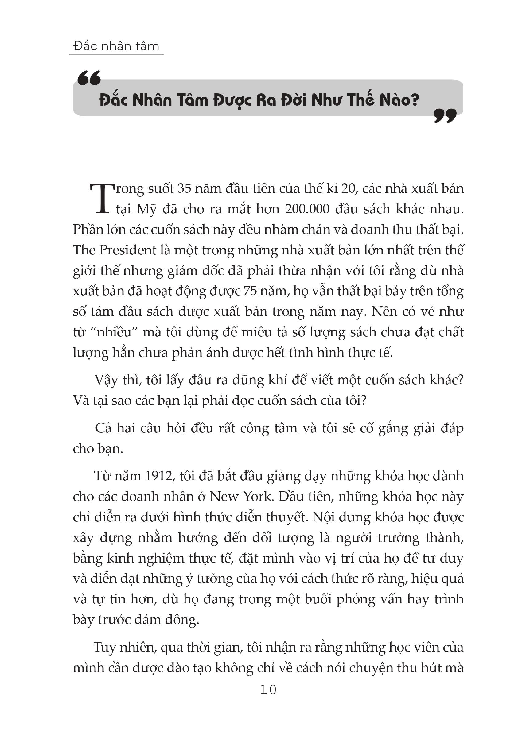 - ĐẮC NHÂN TÂM Nếu bạn còn lúng túng mỗi khi trò chuyện thì cuốn sách Đắc Nhân Tâm của tác giả Dale Carnegie chính là những gì bạn cần. Mỗi trang sách đúc kết kinh nghiệm từ bậc thầy giao tiếp sẽ mở ra những góc nhìn thú vị về tâm lý - hành vi của con người dưới tác động của ngôn từ. Các nguyên tắc trong đây sẽ là chìa khoá giúp cho cuộc sống của bạn trở nên hạnh phúc, thành công hơn. Đây là quyển sách duy nhất về thể loại self-help liên tục đứng đầu danh mục sách bán chạy nhất (best-selling Books) do báo The New York Times bình chọn suốt 10 năm liền và đã được dịch ra hơn 50 ngôn ngữ khác nhau Riêng bản tiếng Anh của sách đã bán được hơn 15 triệu bản trên thế giới. Tác phẩm có sức lan toả vô cùng rộng lớn - dù bạn đi đến bất cứ đâu, bất kỳ quốc gia nào cũng đều có thể nhìn thấy. Tác phẩm được đánh giá là quyển sách đầu tiên và hay nhất, có ảnh hưởng làm thay đổi cuộc đời của hàng triệu người trên thế giới. Đắc nhân tâm là cái Tài trong mỗi người chúng ta. Đắc Nhân Tâm trong ý nghĩa đó cần được thụ đắc bằng sự hiểu rõ bản thân, thành thật với chính mình, hiểu biết và quan tâm đến những người xung quanh để nhìn ra và khơi gợi những tiềm năng ẩn khuất nơi họ, giúp họ phát triển lên một tầm cao mới. Đây chính là nghệ thuật cao nhất về con người và chính là ý nghĩa sâu sắc nhất đúc kết từ những nguyên tắc vàng của Dale Carnegie.