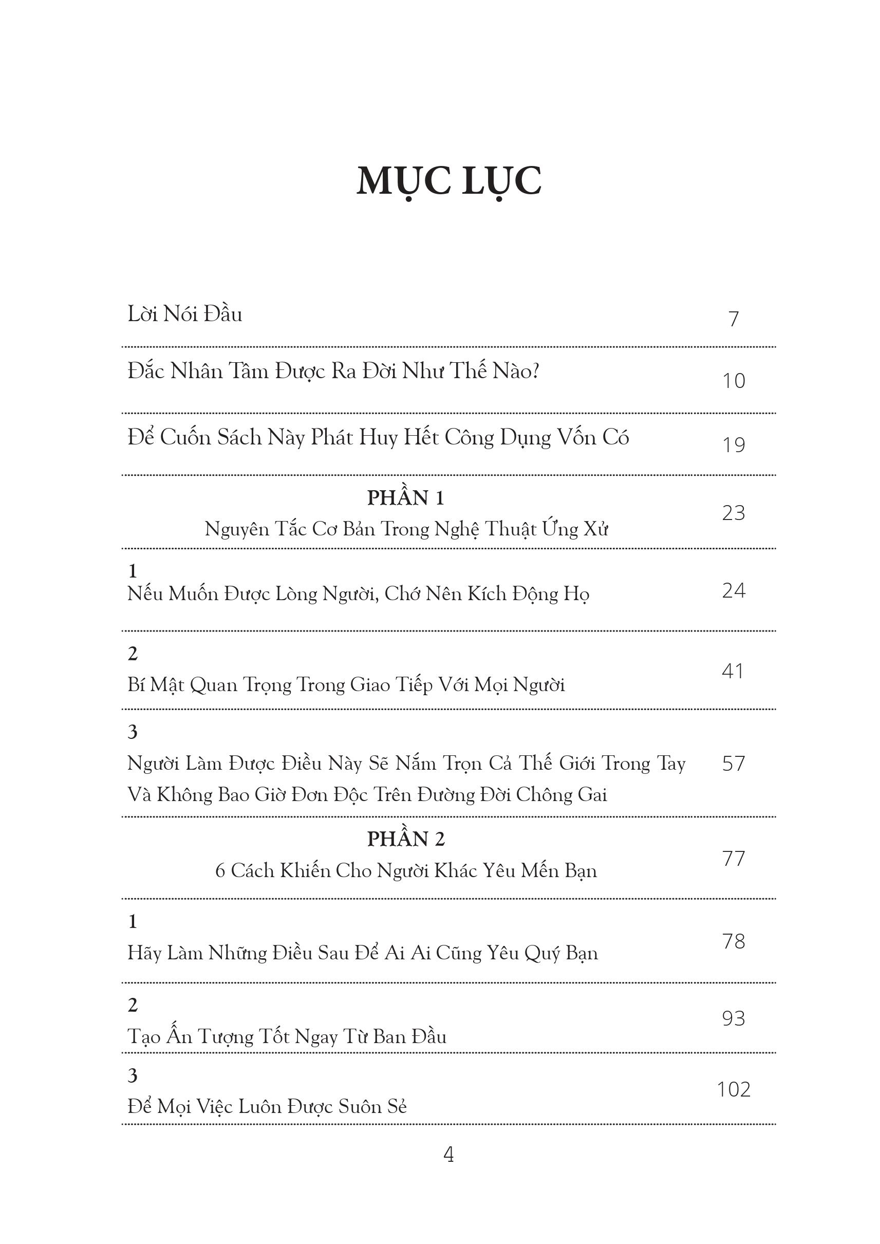 - ĐẮC NHÂN TÂM Cuốn sách bao gồm 4 phần giúp cho mỗi cá nhân sẽ có thể hiểu được nguyên tắc cơ bản về nghệ thuật ứng xử, giúp người khác yêu mến, ủng hộ quan điểm cũng như giúp bạn trở thành một nhà lãnh đạo tài ba. Phần 1: Nguyên tắc cơ bản trong nghệ thuật ứng xử Phần 2: 6 các khiến cho người khác yêu mến bạn Phần 3: Làm sao để người khác ủng hộ quan điểm của bạn Phần 4: Trở thành nhà lãnh đạo: thay đổi quan điểm của người khác mà không vấp phải sự phản bác