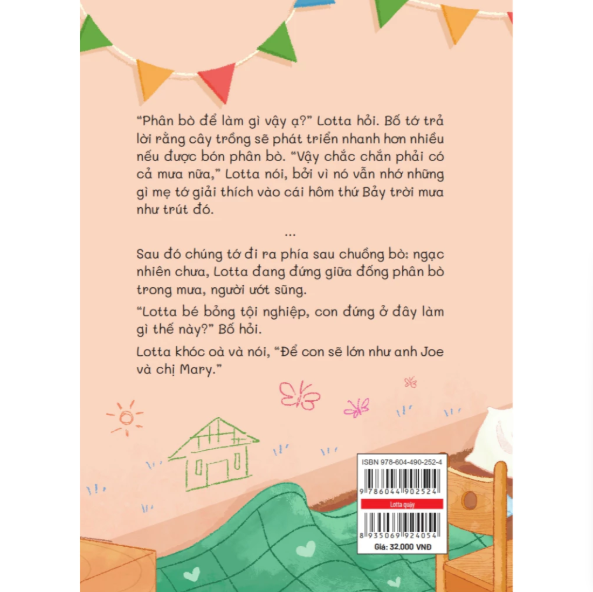 Nhà xuất bản Phụ nữ Việt Nam tiếp tục giới thiệu cho các em những cuốn sách của Astrid Lindgren – cây bút lừng danh Thụy Điển: Lotta bướng như lừa, và Lotta quậy. Nhân vật chính còn nhỏ tuổi hơn cả “lũ trẻ làng Ồn Ào”, em Lotta mới 4 tuổi, nhưng cũng hiếu động và nghịch ngợm không kém gì. Ở bộ truyện này, tác giả đã thay đổi không gian đôi chút: ba anh em nhà Lotta đại diện cho những cô, cậu nhóc sống trên thị trấn. Dẫu vậy, các em vẫn luôn được hòa nhập với thiên nhiên, được về nhà ông bà dưới quê thỏa thích. Dù có sống nơi đâu, trẻ em vẫn luôn mang trong mình thiên hướng vui chơi – vui chơi lành mạnh. Xuyên suốt câu chuyện, không thấy tác giả Astrid Lindgren trực tiếp nhắc đến việc “học”, song qua từng hoạt động sôi nổi, thú vị của mỗi nhân vật chúng ta sẽ cảm nhận được hành trình khám phá, sáng tạo rất rõ nét: bé Lotta học biết rằng phân bón và mưa giúp cây cối sinh trưởng, và bằng trí óc ngây thơ nhưng hết sức “có lý”, bé nhảy vào đứng giữa đống phân, dưới cơn mưa như trút để “lớn như anh Joe và chị Mary”; Joe và Mary quan sát đời sống của chim chóc khi thoăn thoắt leo trèo v.v. Chưa hết, từ chính trò chơi hằng ngày, các em liên tục được tiếp thu những kĩ năng hòa đồng, hòa giải, hay trên hết là cách yêu thương lẫn nhau. Vẫn với giọng kể giản dị, hóm hỉnh và qua góc nhìn đúng nghĩa trẻ thơ, Astrid Lindgren đã một lần nữa cùng những người bạn nhỏ vui cười khúc khích khi lật giở mỗi trang sách – để thêm trân trọng quãng thời gian tự do, hồn nhiên, đầy mê say ấy!