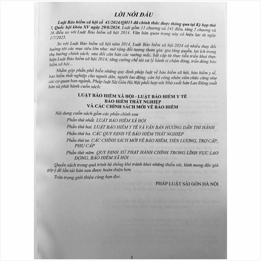 - Toàn bộ sách bìa mềm khổ lớn 20 x 28 cm phân phối bởi Nhà sách Nam Việt đều được bọc sách Plastic MIỄN PHÍ và xuất hóa đơn điện tử đầy đủ, nhanh chóng. …//… Lời giới thiệu: Luật Bảo hiểm xã hội số 41/2024/QH15 đã chính thức được thông qua tại Kỳ họp thứ 7, Quốc hội khóa XV ngày 29/6/2024. Luật gồm 11 chương và 141 điều, tăng 2 chương và 16 điều so với Luật BHXH 2014. Văn bản quan trọng này có hiệu lực từ ngày 1/7/2025. So với Luật BHXH năm 2014, Luật Bảo hiểm xã hội 2024 có nhiều thay đổi hướng tới các mục tiêu lớn như: mở rộng đối tượng tham gia; gia tăng quyền, lợi ích trong thụ hưởng chính sách; sửa đổi căn bản các vướng mắc, bất cập từ thực tiễn triển khai thực hiện Luật BHXH 2014; tăng cường chế tài xử lý hành vi chậm đóng, trốn đóng bảo hiểm xã hội… Nhằm góp phần phổ biến những quy định pháp luật về bảo hiểm xã hội, bảo hiểm y tế, bảo hiểm thất nghiệp cho người dân, người lao động, cán bộ công nhân viên chức cũng như các cơ quan ban ngành, Nhà sách Nam Việt xin trân trọng giới thiệu cuốn sách: Sách Luật Bảo Hiểm Xã Hội - Luật Bảo Hiểm Y Tế - Bảo Hiểm Thất Nghiệp và Các Chính Sách Mới về Bảo Hiểm …//… Nội dung sách gồm 5 phần sau: Phần thứ nhất. Luật Bảo hiểm xã hội 2024 Phần thứ hai. Luật Bảo hiểm y tế và văn bản hướng dẫn thi hành Phần thứ ba. Các quy định về bảo hiểm thất nghiệp Phần thứ tư. Các chính sách mới về bảo hiểm, tiền lương, trợ cấp, phụ cấp Phần thứ năm. Quy định xử phạt hành chính trong lĩnh vực lao động, bảo hiểm xã hội *** Quý khách hàng hãy an tâm khi mua sách tại Nhà sách Nam Việt, cam kết uy tín, chất lượng, sách bản gốc chuẩn đẹp, được kiểm hàng, hài lòng mới thanh toán, sách đã được bọc plastic cao cấp miễn phí! …//… Cảm ơn các bạn đã ghé thăm shop Nhà sách Nam Việt ! Sách Luật Bảo Hiểm Xã Hội - Luật Bảo Hiểm Y Tế - Bảo Hiểm Thất Nghiệp và Các Chính Sách Mới về Bảo Hiểm Sách Luật Bảo Hiểm Xã Hội - Luật Bảo Hiểm Y Tế - Bảo Hiểm Thất Nghiệp và Các Chính Sách Mới về Bảo Hiểm