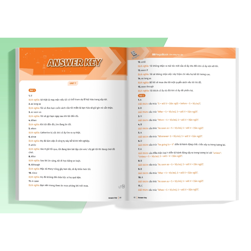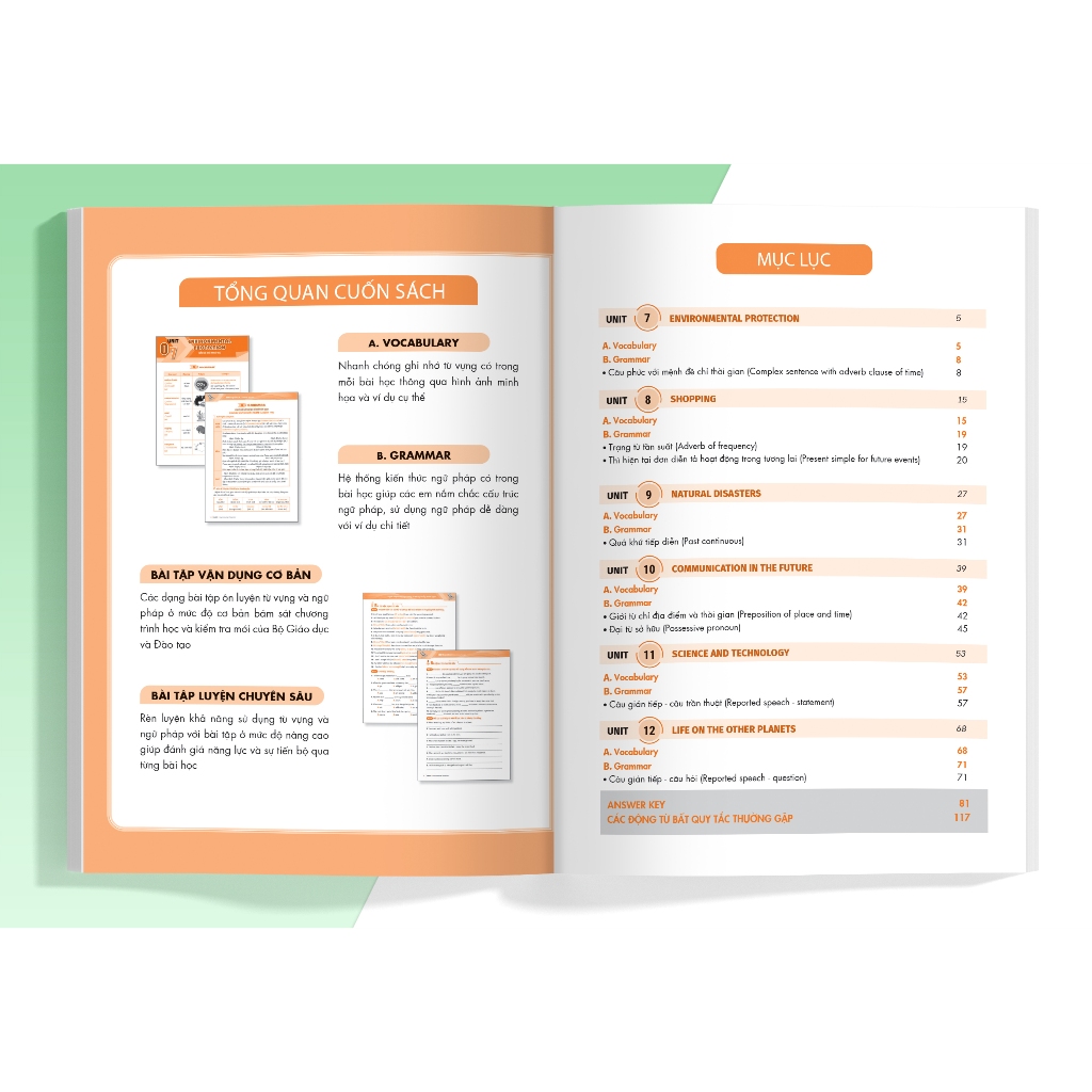 ƯU ĐIỂM NỔI BẬT CỦA CUỐN SÁCH 1. Bám sát khung chương trình của Bộ Giáo dục và Đào tạo Lớp 8 Nội dung bám sát khung chương trình giáo dục phổ thông mới Lớp 8 của Bộ Giáo dục và Đào tạo giúp các em nắm vững kiến thức đã học trên lớp cũng như ôn luyện thêm các bài tập nâng cao, hỗ trợ quá trình tự học tiếng Anh hiệu quả. Áp dụng kĩ thuật xây dựng ma trận đề kiểm tra của Bộ Giáo dục và Đào tạo giúp các em ôn lại toàn bộ kiến thức đã học, đồng thời làm quen với nội dung kiến thức mới. 2. Nội dung được thiết kế sinh động, logic dễ nhớ Cuốn sách giúp bạn học nhanh chóng ghi nhớ từ vựng có trong mỗi bài học thông qua hình ảnh minh họa và ví dụ cụ thể. Hệ thống kiến thức ngữ pháp có trong bài học giúp các em nắm chắc cấu trúc ngữ pháp, sử dụng ngữ pháp dễ dàng với ví dụ chi tiết 3. Bài tập vận dụng đa dạng Bài tập vận dụng được chia thành 2 phần Bài tập vận dụng cơ bản: Các dạng bài tập ôn luyện từ vựng và ngữ pháp ở mức độ cơ bản bám sát chương trình học và kiểm tra mới của bộ giáo dục và đào tạo Bài tập vận dụng nâng cao: Rèn luyện khả năng sử dụng từ vựng và ngữ pháp với bài tập ở mức độ nâng cao giúp đánh giá năng lực và sự tiến bộ qua từng bài học. 4. Lời giải chi tiết Hệ thống lời giải chi tiết. Không chỉ được trình bày, giải thích một cách dễ hiểu, kĩ lưỡng, hệ thống lời giải chuyên sâu cũng được bổ sung và mở rộng giúp các em có thể tiếp thu nhiều kiến thức nâng cao và toàn diện hơn. Rất nhiều mẹo giải hay, dễ dàng vận dụng, dễ nhớ sẽ giúp các em làm bài nhanh hơn, đạt điểm cao hơn. Từ đó, các em sẽ tăng thêm niềm hứng thú với môn học này. Megabook hi vọng rằng Bộ sách “Combo Luyện chuyên sâu ngữ pháp và bài tập tiếng anh Lớp 8 (Global) (2 Tập)” sẽ luôn là người bạn đồng hành của các em học sinh và là sự tin tưởng hàng đầu của các thầy cô giáo và các quý phụ huynh!