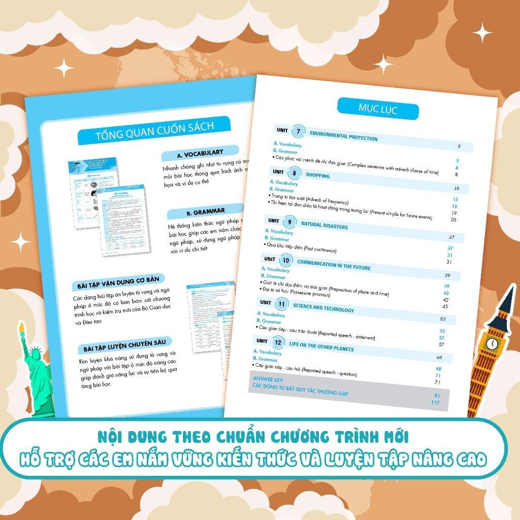 - Nội dung được thiết kế sinh động, logic dễ nhớ Cuốn sách giúp bạn học nhanh chóng ghi nhớ từ vựng có trong mỗi bài học thông qua hình ảnh minh họa và ví dụ cụ thể. Hệ thống kiến thức ngữ pháp có trong bài học giúp các em nắm chắc cấu trúc ngữ pháp, sử dụng ngữ pháp dễ dàng với ví dụ chi tiết