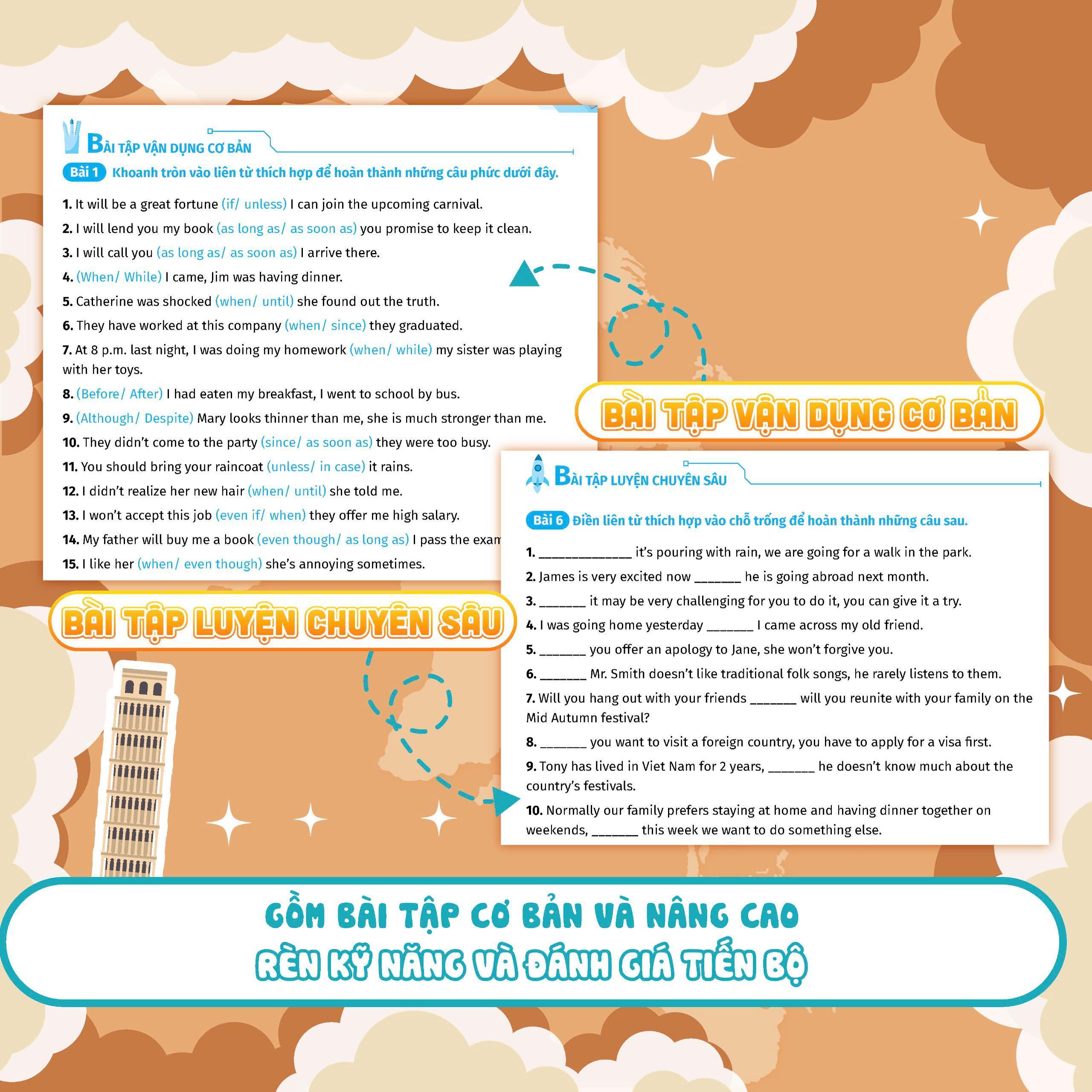 - Bài tập vận dụng đa dạng Bài tập vận dụng được chia thành 2 phần Bài tập vận dụng cơ bản: Các dạng bài tập ôn luyện từ vựng và ngữ pháp ở mức độ cơ bản bám sát chương trình học và kiểm tra mới của bộ giáo dục và đào tạo Bài tập vận dụng nâng cao: Rèn luyện khả năng sử dụng từ vựng và ngữ pháp với bài tập ở mức độ nâng cao giúp đánh giá năng lực và sự tiến bộ qua từng bài học.