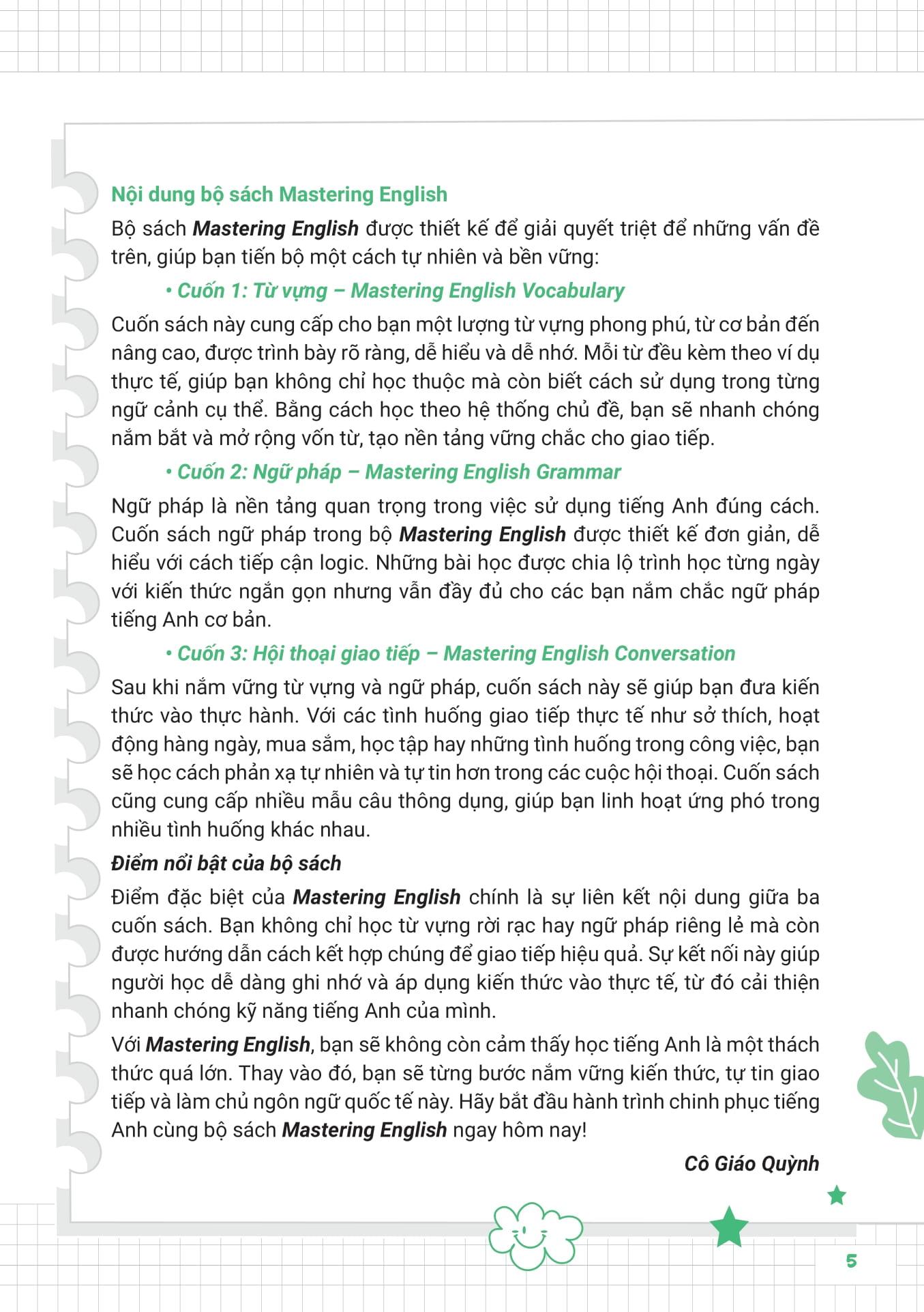 Mastering English Grammar - 180 Ngày Làm Chủ Ngữ Pháp Tiếng Anh Cuốn sách Mastering English Grammar – 180 Ngày Làm Chủ Ngữ Pháp Tiếng Anh mang lại nhiều lợi ích thiết thực cho người học: Xây dựng nền tảng ngữ pháp vững chắc: Bạn sẽ nắm vững các chủ điểm ngữ pháp từ cơ bản đến nâng cao, giúp tự tin hơn khi giao tiếp và viết tiếng Anh. Học tập đều đặn và hiệu quả: Với lộ trình 180 ngày, bạn sẽ dần dần xây dựng kiến thức ngữ pháp mà không cảm thấy quá tải. Ứng dụng kiến thức vào thực tế: Cuốn sách có phần luyện tập giúp bạn ôn tập và củng cố kiến thức, đồng thời tăng khả năng phản xạ khi sử dụng ngữ pháp trong giao tiếp. Phát triển toàn diện kỹ năng tiếng Anh: Kết hợp với từ vựng và hội thoại trong bộ Mastering English, bạn sẽ có một phương pháp học tiếng Anh toàn diện và logic.