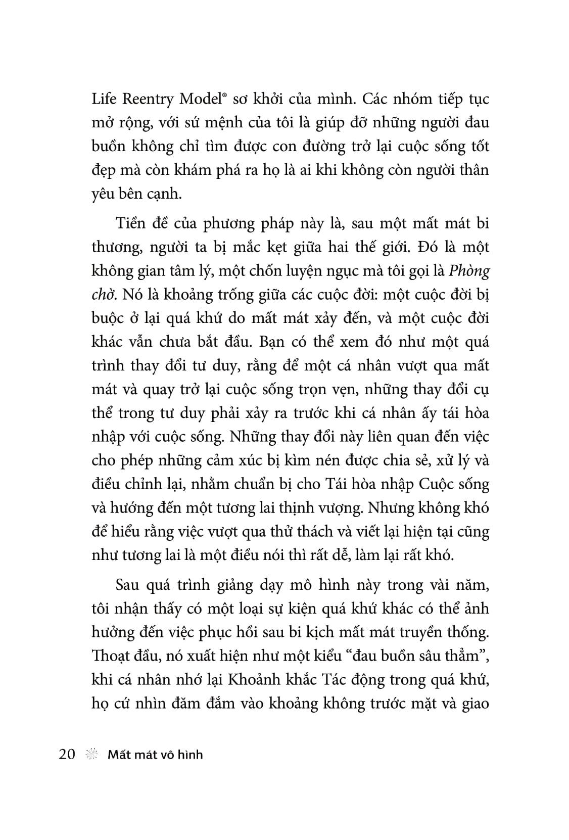 Mất Mát Vô Hình - Invisible Loss MẤT MÁT VÔ HÌNH – NHẬN DIỆN VÀ CHỮA LÀNH NHỮNG NỖI ĐAU THẦM LẶNG Có những mất mát trong cuộc đời đến như một cú sốc, rõ ràng và dễ gọi tên, như sự ra đi của một người thân yêu, một cuộc ly hôn, hay sự tan vỡ của một mối quan hệ quan trọng. Nhưng cũng có những mất mát không dễ nhận diện – những nỗi đau mà chúng ta trải qua nhưng không được công nhận, không được gọi tên, và dường như không ai thấy. Đó chính là Mất mát vô hình – thứ cảm giác âm ỉ len lỏi vào tâm hồn, làm thay đổi cách ta nhìn nhận bản thân và thế giới, nhưng lại bị bỏ qua bởi không đủ rõ ràng để được xem là một mất mát thực sự. Trong cuốn sách Mất mát vô hình, tác giả Christina Rasmussen đã chỉ ra rằng những tổn thương âm thầm này có thể ảnh hưởng sâu sắc đến cuộc sống của chúng ta như thế nào. Cuốn sách không chỉ giúp độc giả nhận diện những mất mát vô hình mà m.ình đã trải qua, mà còn cung cấp các công cụ để chữa lành và tìm lại chính m.ình. Nhận diện những mất mát không lời Chúng ta thường nghĩ đến nỗi buồn và đau khổ khi đối mặt với những mất mát rõ ràng, nhưng Christina Rasmussen chỉ ra rằng Mất mát vô hình không nhất thiết phải đến từ một sự kiện lớn hay bi thảm. Đó có thể là cảm giác không được lắng nghe, bị hiểu lầm, hay không được công nhận trong một thời gian dài. Những khoảnh khắc bị xem nhẹ, bị bỏ qua, hay cảm giác không thuộc về cũng là những dạng mất mát có thể ăn sâu vào tâm lý, hình thành nên cách chúng ta nhìn nhận chính m.ình. Tác giả đưa ra khái niệm Phòng chờ – nơi mà những người từng trải qua mất mát vô hình mắc kẹt. Họ có thể sống trong trạng thái chấp nhận, thích nghi nhưng không thực sự phát triển. Họ tiếp tục công việc, duy trì các mối quan hệ và làm mọi thứ theo đúng trách nhiệm, nhưng lại không cảm thấy kết nối với cuộc sống. Đó là dấu hiệu của một người đang sinh tồn, chứ không phải thực sự sống. Rasmussen sử dụng nhiều câu chuyện thực tế để minh họa cách mọi người đã rơi vào trạng thái này. Một số người bị mắc kẹt trong cảm giác mất mát mà không nhận ra, trong khi những người khác có thể cảm thấy một sự trống rỗng nhưng không thể giải thích được nguyên nhân. Hành trình chữa lành: Từ sống sót đến tái hòa nhập cuộc sống Một trong những đóng góp quan trọng nhất của cuốn sách là Mô hình Tái hòa nhập Cuộc sống (Life Reentry Model), phương pháp giúp người đọc thoát khỏi Phòng chờ và bắt đầu hành trình phục hồi. Christina Rasmussen đã thiết kế mô hình này sau nhiều năm nghiên cứu và thực hành, giúp những người từng trải qua mất mát có thể tìm lại bản thân và quay trở lại cuộc sống với một ý nghĩa mới. Mô hình này được chia thành năm giai đoạn chính:
