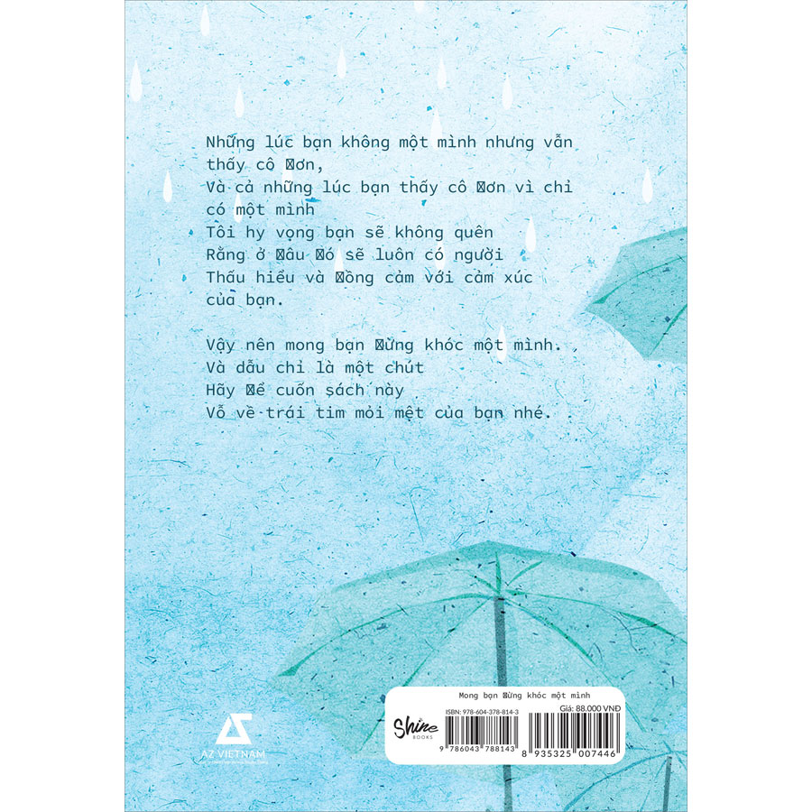 Những lúc bạn không một mình nhưng vẫn thấy cô đơn, Và cả những lúc bạn thấy cô đơn vì chỉ có một mình Tôi hy vọng bạn sẽ không quên Rằng ở đâu đó sẽ luôn có người Thấu hiểu và đồng cảm với cảm xúc của bạn. Vậy nên mong bạn đừng khóc một mình. Và dẫu chỉ là một chút Hãy để cuốn sách này Vỗ về trái tim mỏi mệt của bạn nhé. Trích dẫn trong sách: Kẻ thù lớn nhất của ta là chính mình, Nhưng người ta cần tin tưởng nhất cũng là bản thân. Hy vọng bạn sẽ không quên điều này.