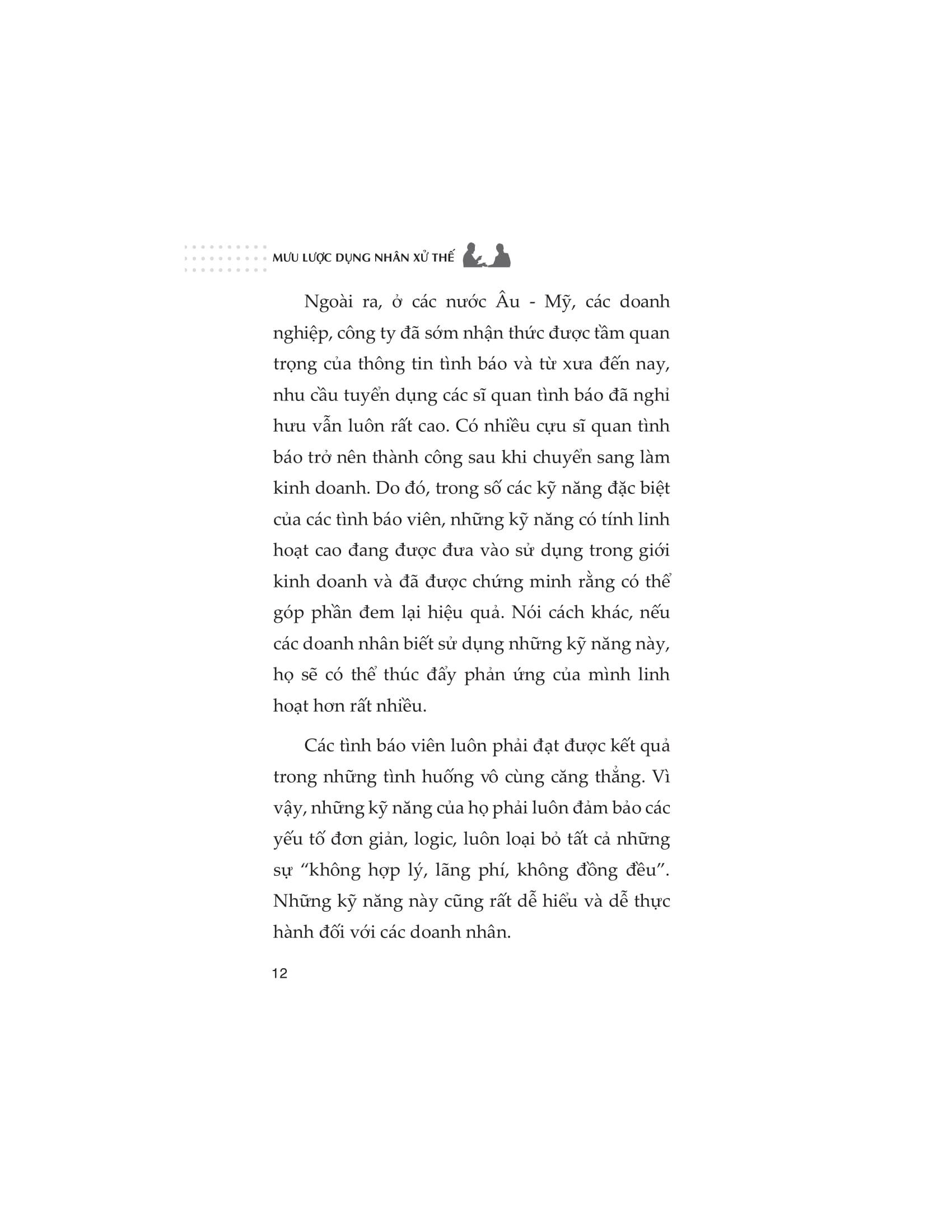 Các điệp viên tình báo, hay còn gọi là tình báo viên, được coi là lực lượng tinh nhuệ hàng đầu. Họ được đào tạo, huấn luyện và rèn giũa để có thể hoàn thành những nhiệm vụ gian khổ, khó nhằn nhất một cách bình tĩnh và nhanh chóng, dù trong bất kỳ điều kiện, hoàn cảnh nào. Họ đã làm điều đó bằng cách nào? Những kỹ thuật của họ tài tình ra sao? Chúng có liên quan gì đến công việc kinh doanh ngoài thực tế? Câu trả lời đều có trong cuốn sách này.