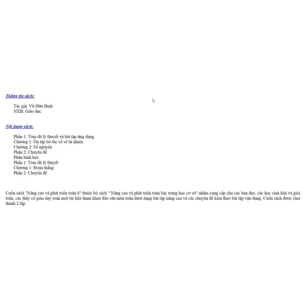 Cuốn sách Nâng cao và phát triển Toán 6 - Tập 1 gồm các bài tập về số tự nhiên và số nguyên với 9 chuyên đề: điền chữ số, dãy các số viết theo quy luật, đếm số, sơ lược về tập hợp, tìm chữ số tận cùng của một luỹ thừa, các bài tập hình học với một chuyên đề. Tất cả các đề mục của chương trình đều có các bài tập tương ứng, đó là các bài tập cơ bản và tiêu biểu để bồi dưỡng học sinh lớp 6 về môn Toá