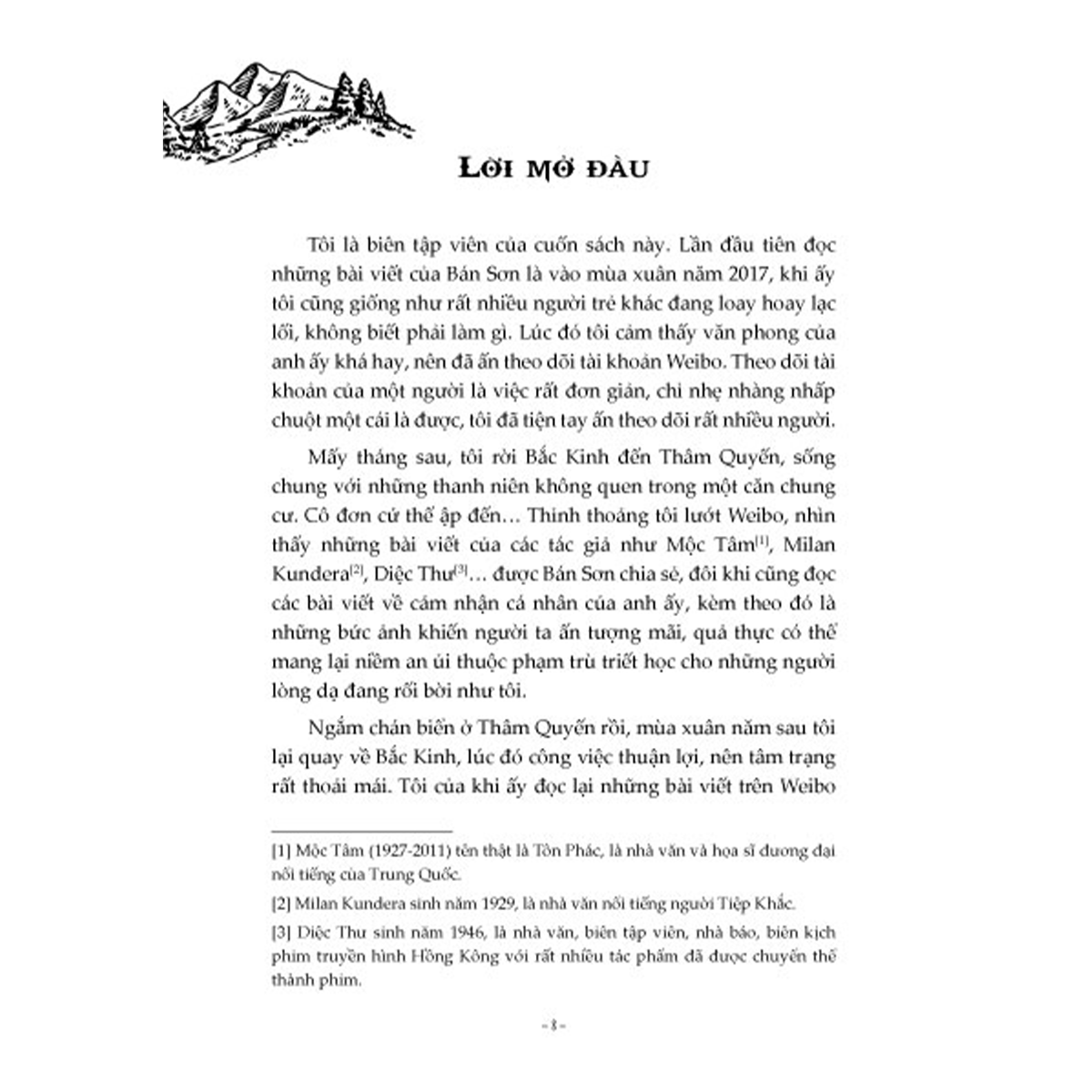 Tác giả Bán Sơn ghi lại những trải nghiệm cuộc sống từ đô thị náo nhiệt đến núi Nga Mi yên tĩnh, từ bối rối và cô đơn đến tiêu hóa nỗi cô đơn, đạt được sự bình tĩnh, tìm được mục đích ban đầu và đạt được trí tuệ.