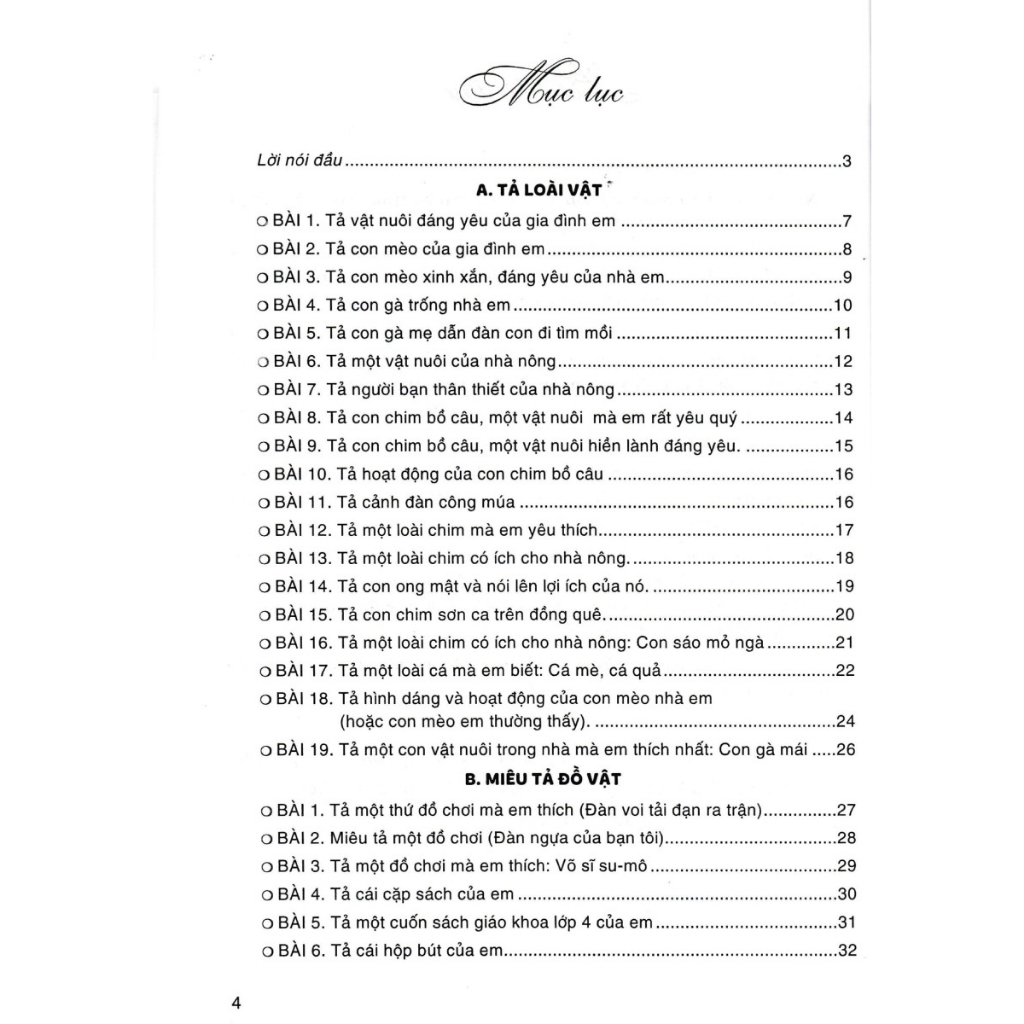 Tổng hợp các bài văn lớp 4 hay Nội dung miêu tả cho từng đề tài đa dạng Nhân dịp cuốn sách được xuất bản, xin bày tỏ tình cảm trân trọng, quý trọng và biết ơn chân thành, sâu sắc, gửi tới các em nhỏ - tác giả bài văn hiện diện trong cuốn sách, và các thầy cô giáo Tiểu học đã giúp đỡ chúng tôi một cách vô tư, nhiệt thành. Hy vọng cuốn sách "Những bài văn miêu tả lớp 4" sẽ trở thành người bạn nhỏ thân thiết, tin cậy của các em