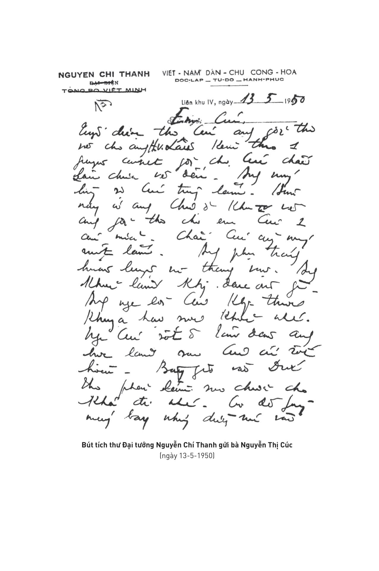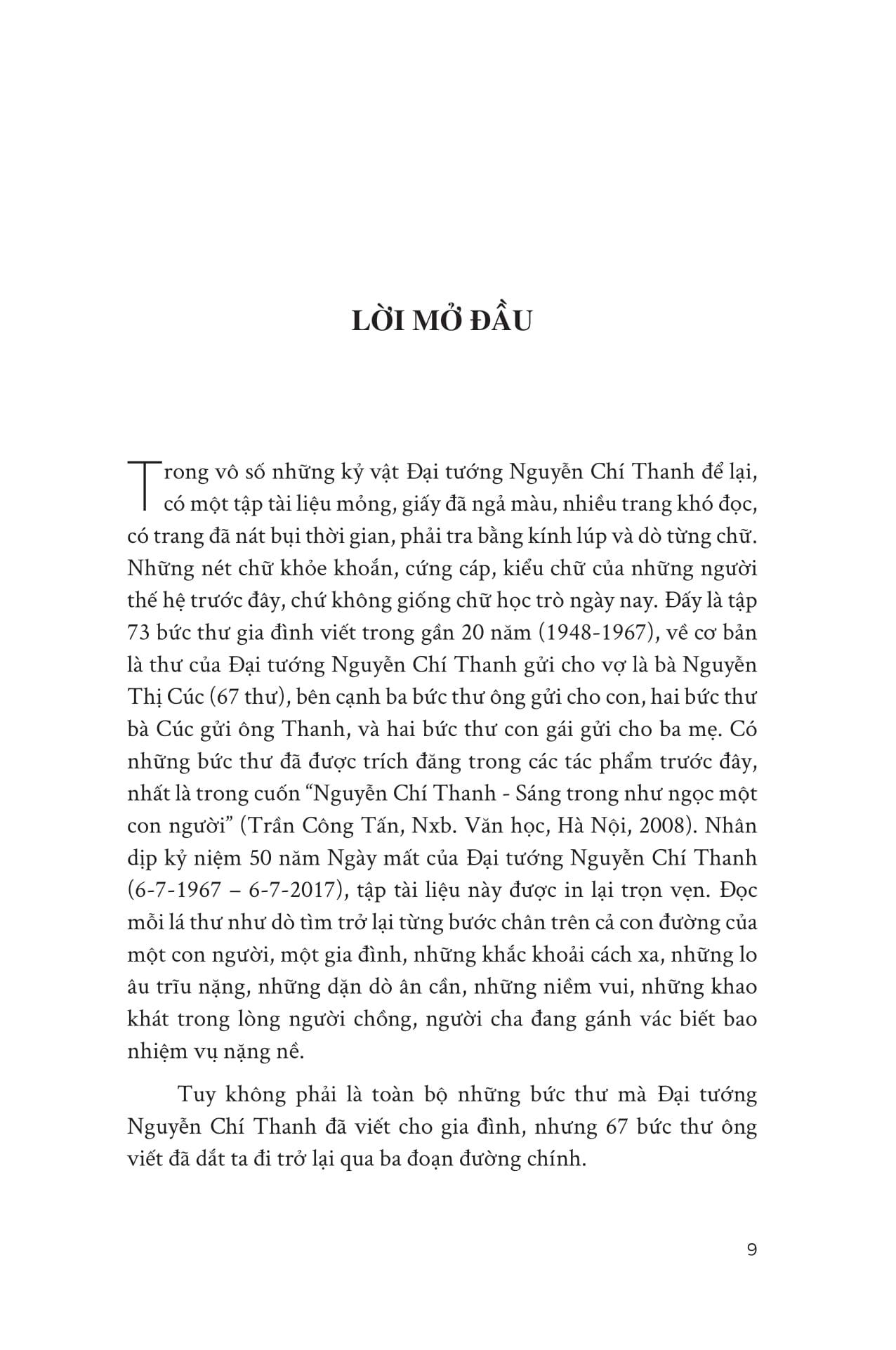 3. Những cánh thư ra Bắc vào Nam TRÍCH ĐOẠN/ CÂU QUOTE HAY “Những lá thư này là một di sản Ba Thanh để lại, dành riêng cho con cháu, để họ truyền lại cho mãi mãi những lứa cháu con sau này… như những giọt sữa nuôi dưỡng trong cả cuộc đời, như những dòng máu tiếp tục chảy trong huyết quản” (Trích Lời mở đầu) “Không được thơ Cúc, anh phần thì trông mong, phần thì áy náy, không biết m.ình ăn ở với vợ con thế nào mà đến khi xa nhau phải thế. Em cũng biết tuy nhớ nhau nhiều ngày hay sinh ra nghĩ thế này thế khác, tâm lý ấy cũng có gì là lạ.” (Trích thư Đại tướng Nguyễn Chí Thanh gửi vợ Nguyễn Thị Cúc, ngày 5-7-1950) “Ba dặn các con đây này: Phải gắng học cho giỏi, tính nết cho tốt, làm việc cho khá. Ba chúc các con ngoan để sau này thành người có đạo đức.” (Trích thư Đại tướng Nguyễn Chí Thanh gửi gia đình, tháng 11-1964) “… Đại tướng Nguyễn Chí Thanh vẫn luôn hiện hữu trong cuộc đời chúng ta. Trong các văn kiện, tài liệu của Đảng và Nhà nước. Trong những bộ sách. Trong những cuốn phim. Qua các kỷ vật trong viện bảo tàng. Qua rất nhiều bài viết trên báo chí. Qua truyền hình và đài phát thanh. Với những bức tượng ở quảng trường, trong các khu lưu niệm. Với những miếu thờ giản dị nơi thôn dã...” (Trích Tòng Bạt) “Chúng ta đã đọc những bài báo của Đại tướng với bút danh “Trường Sơn” - những bài viết làm nức lòng dân tộc trong những năm đánh Mỹ. Chúng ta quen với một giọng văn đanh thép, sắc sảo, hào hùng, một tư duy sáng suốt đầy sức thuyết phục, một thái độ tận tụy, kiên trung quyết tâm chiến đấu và sẵn sàng hy sinh. Chúng ta cũng biết đến những bài nói sảng khoái, chân tình khi vị tướng nông dân lội bùn trên những cánh đồng hợp tác, điểm xuyết những câu hò man mác những triền sông. Chúng ta cũng đã đọc những câu chuyện phảng phất màu sắc huyền thoại nhưng lại rất thực, kể về một cán bộ lãnh đạo cao cấp cõng cấp dưới qua suối, hay một chỉ huy quân đội “bênh vực” một làn điệu quan họ. Bây giờ, đọc lại những bức thư viết từ khoảng xa là 69, gần là 49 năm trước, ta gặp lại vẫn Nguyễn Chí Thanh ấy, nhưng trong nỗi chờ mong thư vợ, mong đến mức tỷ mẩn đếm từng lá thư, băn khoăn đến mức so sánh số thư gửi đi với số thư nhận được, rồi nghĩ ra đủ thứ lý do để mà lo lắng, băn khoăn, nào là ốm đau, nào là giận hờn, nào là bom lửa… Ta thấy vị Đại tướng ngày nào sao mà gần gũi, sao mà thân thương, trong những khía cạnh hết sức đời thường. Giống như tôi, giống như bạn. Những lá thư trở nên tư liệu lịch sử đầy tính nhân văn.” … “Đọc mỗi lá thư như dò tìm trở lại từng bước chân trên cả con đường của một con người, một gia đình, những khắc khoải cách xa, những lo âu trĩu nặng, những dặn dò ân cần, những niềm vui, những khao khát trong lòng người chồng, người cha đang gánh vác biết bao nhiệm vụ nặng nề.” (Trích Lời mở đầu)