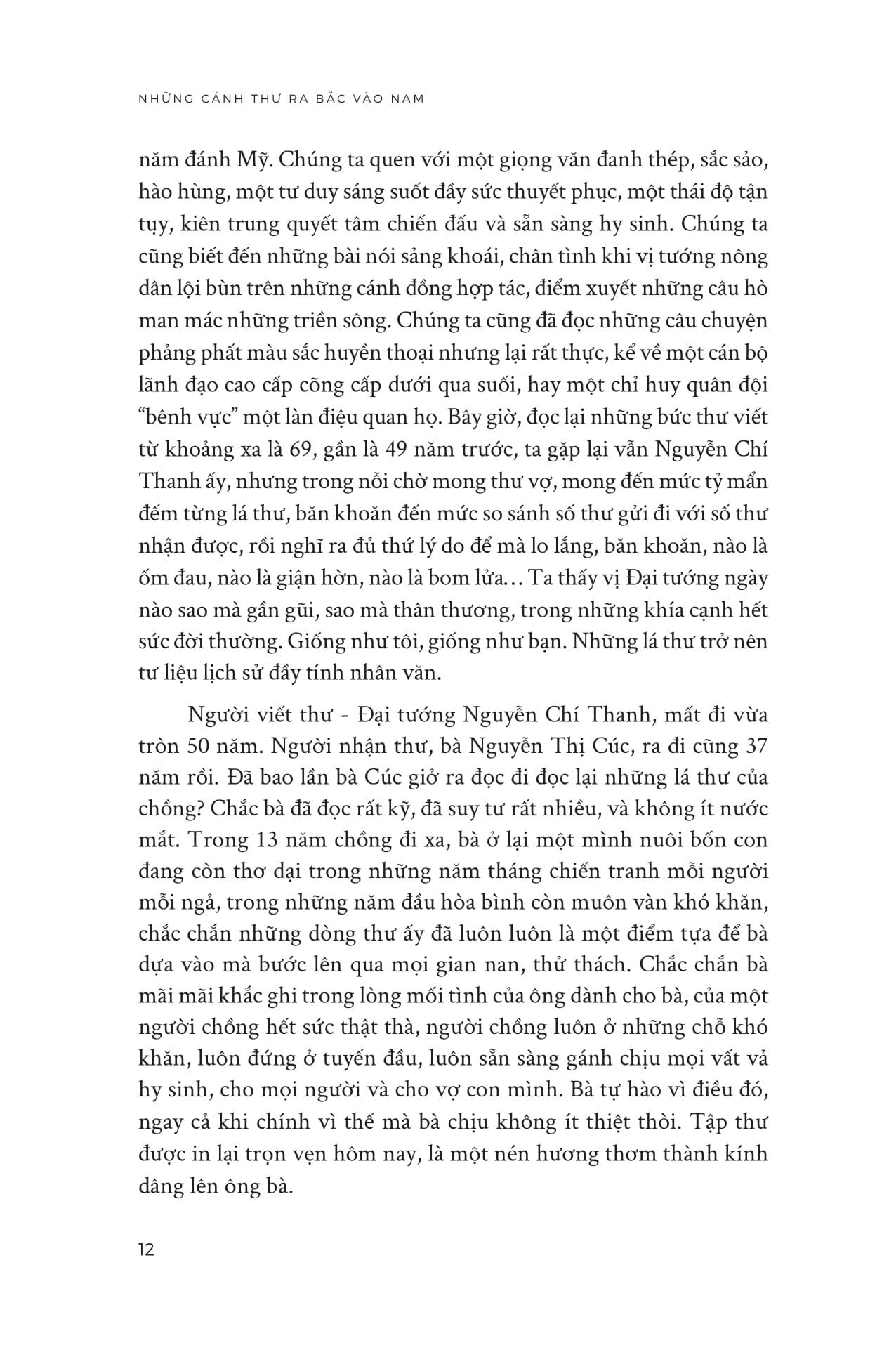 Những Cánh Thư Ra Bắc Vào Nam “Những cánh thư ra Bắc vào Nam” là tập hợp 73 bức thư của Đại tướng Nguyễn Chí Thanh và gia đình, viết trong gần 20 năm (1948–1967), từ kháng chiến chống Pháp đến những năm chống Mỹ ác liệt. Phần lớn là thư ông gửi cho vợ – bà Nguyễn Thị Cúc, xen lẫn vài bức gửi cho các con và thư từ hồi âm. Cuốn sách nằm trong Bộ sách Gia đình “Tướng Thanh – Tướng Vịnh” gồm 4 cuốn: "Những câu chuyện về Đại tướng Nguyễn Chí Thanh", "Hành trình vì hòa bình (Hồi ức)", "Những cánh thư ra Bắc vào Nam", "Nguyễn Chí Thanh - Những góc nhìn từ hậu thế". Đó là những lá thư giản dị, ngắn gọn nhưng chan chứa tình cảm, thể hiện nỗi lo lắng, dặn dò về sức khỏe, học tập và đạo đức cho con cái, đồng thời phảng phất tinh thần cách mạng kiên cường. Trong từng dòng chữ, hiện lên chân dung một vị tướng vừa là người lãnh đạo chiến trường, vừa là người chồng, người cha bình dị, luôn khắc khoải nhớ thương gia đình. Những bức thư không chỉ là tư liệu lịch sử quý giá mà còn là di sản tinh thần, tỏa sáng tình yêu thương và khí phách Việt Nam, trở thành nguồn cảm hứng sâu sắc cho các thế hệ hôm nay. Cuốn sách được chia làm 2 phần nội dung: