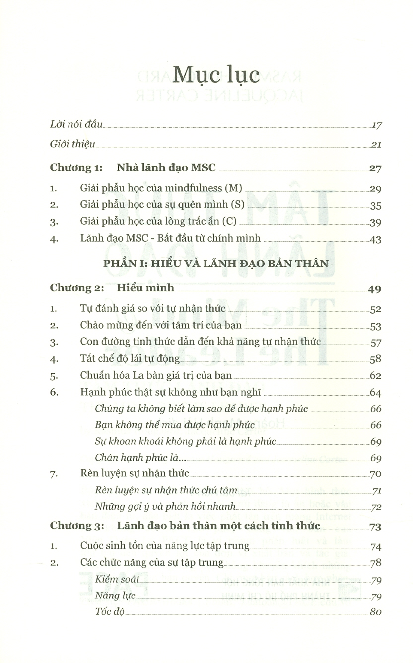 Rasmus Hougaard và Jacqueline Carter đã chia sẻ: “Chúng tôi tự tin mang đến cho bạn cuốn sách này. Trong quá trình phát triển của nó, chúng tôi đã được đứng trên vai những người khổng lồ: Những bậc thầy về rèn luyện tâm trí đã truyền cảm hứng cho chúng tôi trong nhiều thập niên, các nhà quản lý điều hành đã tặng chúng tôi trí tuệ của họ, và các nhà nghiên cứu đã chia sẻ những điều tìm thấy. Giờ đây bạn được chào đón vào cuộc hành trình dài nhưng bạn không phải cô đơn. Hàng ngàn người đã đi qua các bài thực hành này trước bạn và đã chuyển biến, thay đổi bản thân và cách họ lãnh đạo. Bạn sắp sửa nhập vào dòng người đang di chuyển và chúng tôi đang ở đây, sẵn sàng hỗ trợ trên con đường bạn sẽ đi qua.”