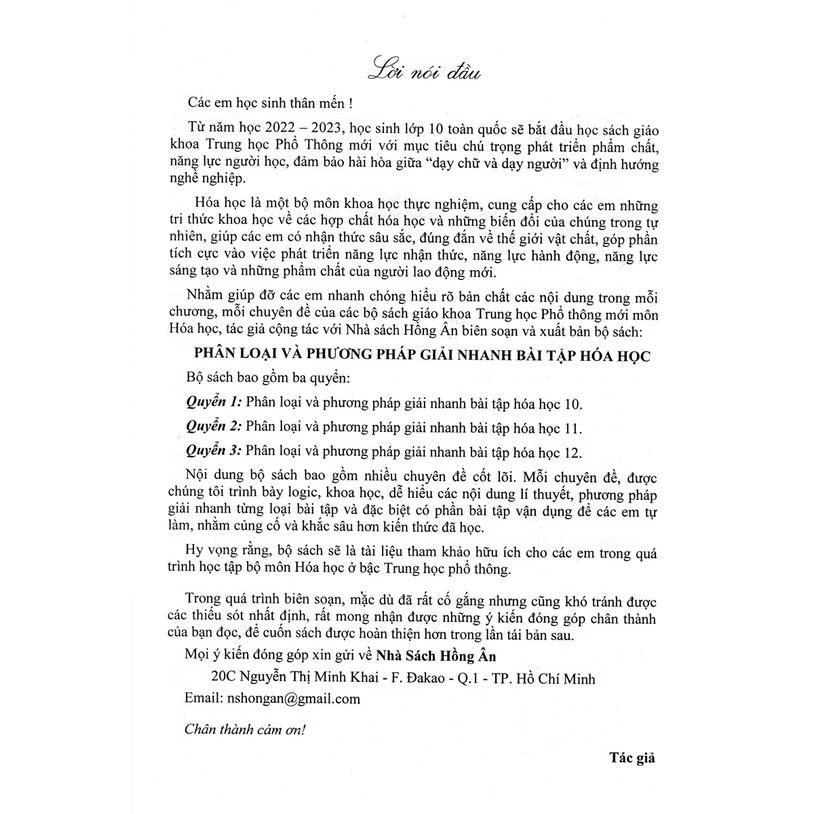 Để nắm vững kiến thức và có thể đạt kết quả cao nhất trong các kì thi, các em học sinh cần rèn luyện giải nhanh các dạng bài tập thường xuyên, liên tục trong quá trình học tập của mình. Để các em có thêm tài liệu tham khảo để tự rèn luyện các kĩ năng giải bài tập. Chúng tôi xin trân trọng giới thiệu bộ sách: “ Phân dạng và phương pháp giải nhanh bài tập hóa học 10”.