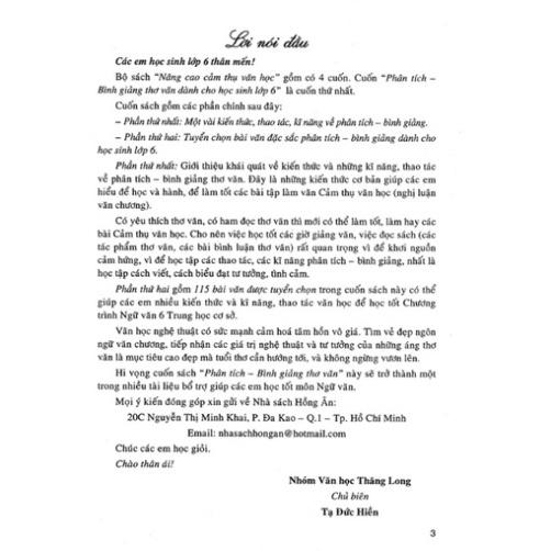 Bộ sách “Nâng cao cảm thụ văn học” gồm có 4 cuốn. Cuốn Phân Tích Bình Giảng Thơ Văn Lớp 6 là cuốn thứ nhất.