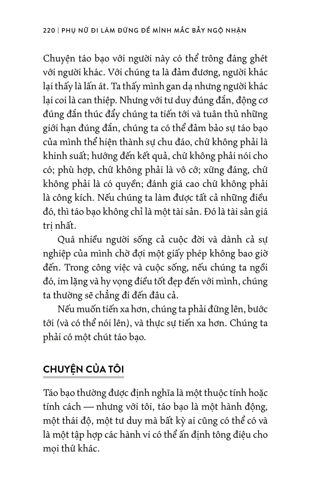 Và không chỉ cho thấy 15 quan niệm đó dẫn dắt phụ nữ đến đâu, tác giả — phó chủ tịch NBCUniversal (một trong những phụ nữ quyền lực của điện ảnh-truyền hình-truyền thông) — đề ra 15 quan điểm đối trọng súc tích, dễ dàng triển khai thành sách lược “phá bẫy ngộ nhận” để tiến lên.