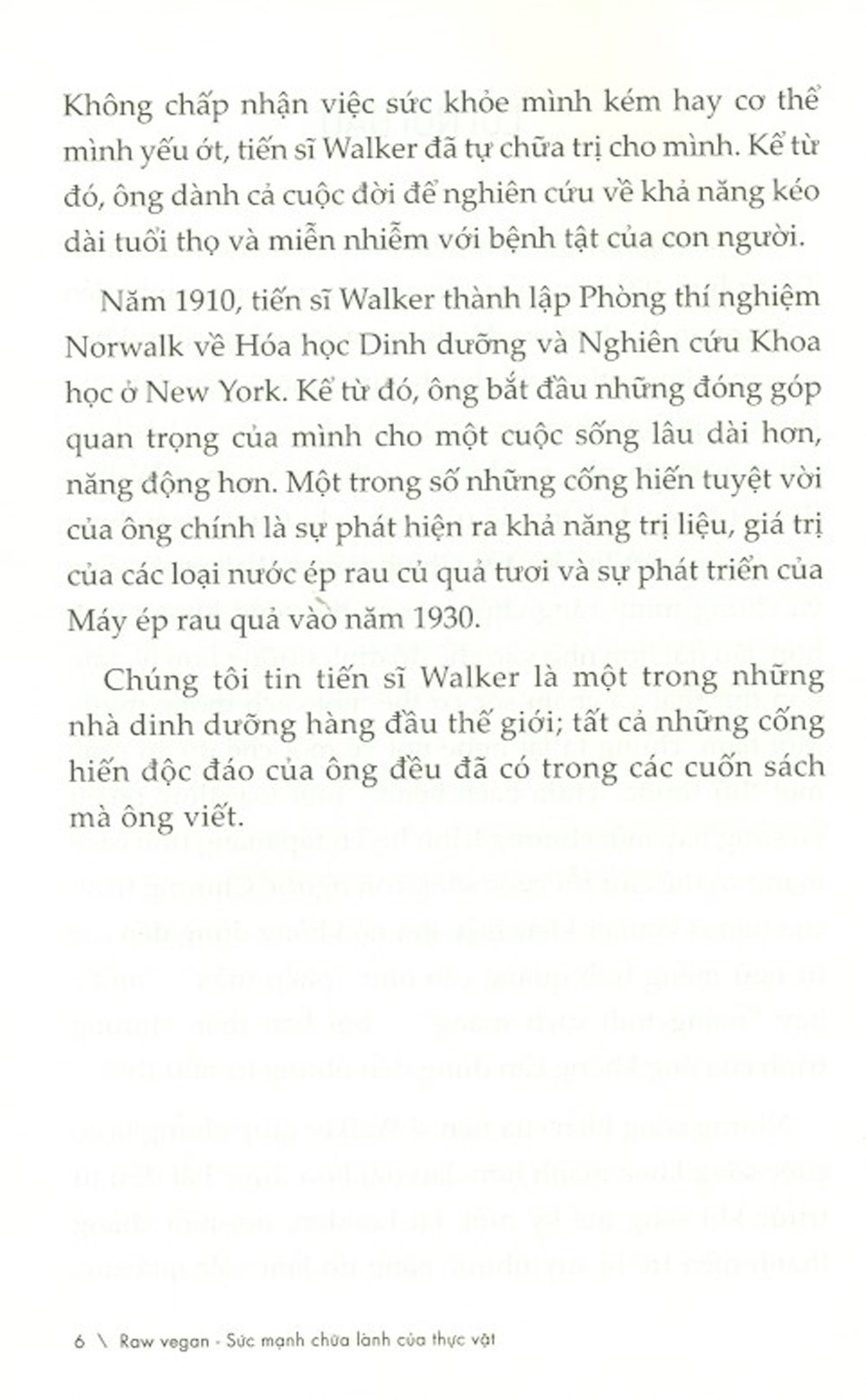 “Raw vegan - sức mạnh chữa lành của thực vật” - công trình nghiên cứu công phu và đầy đủ nhất của TS. Norman W. Walker về chế độ ăn thuần thực vật và lối sống khoa học, là cuốn sách mà mỗi gia đình nên đặt trong tủ sách sức khỏe và căn bếp của mình để nhắc nhở mỗi người: